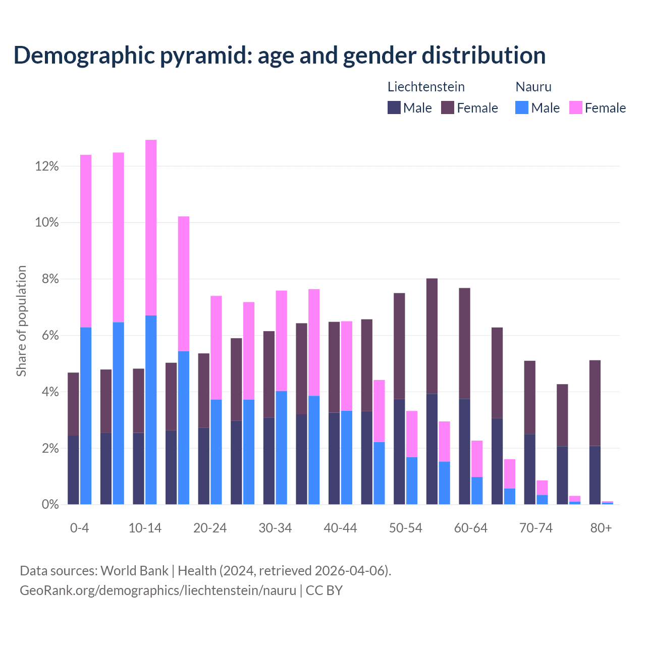 - As of 2026, the population of Liechtenstein is 41K vs 12.1K in Nauru - 3.38 times difference.