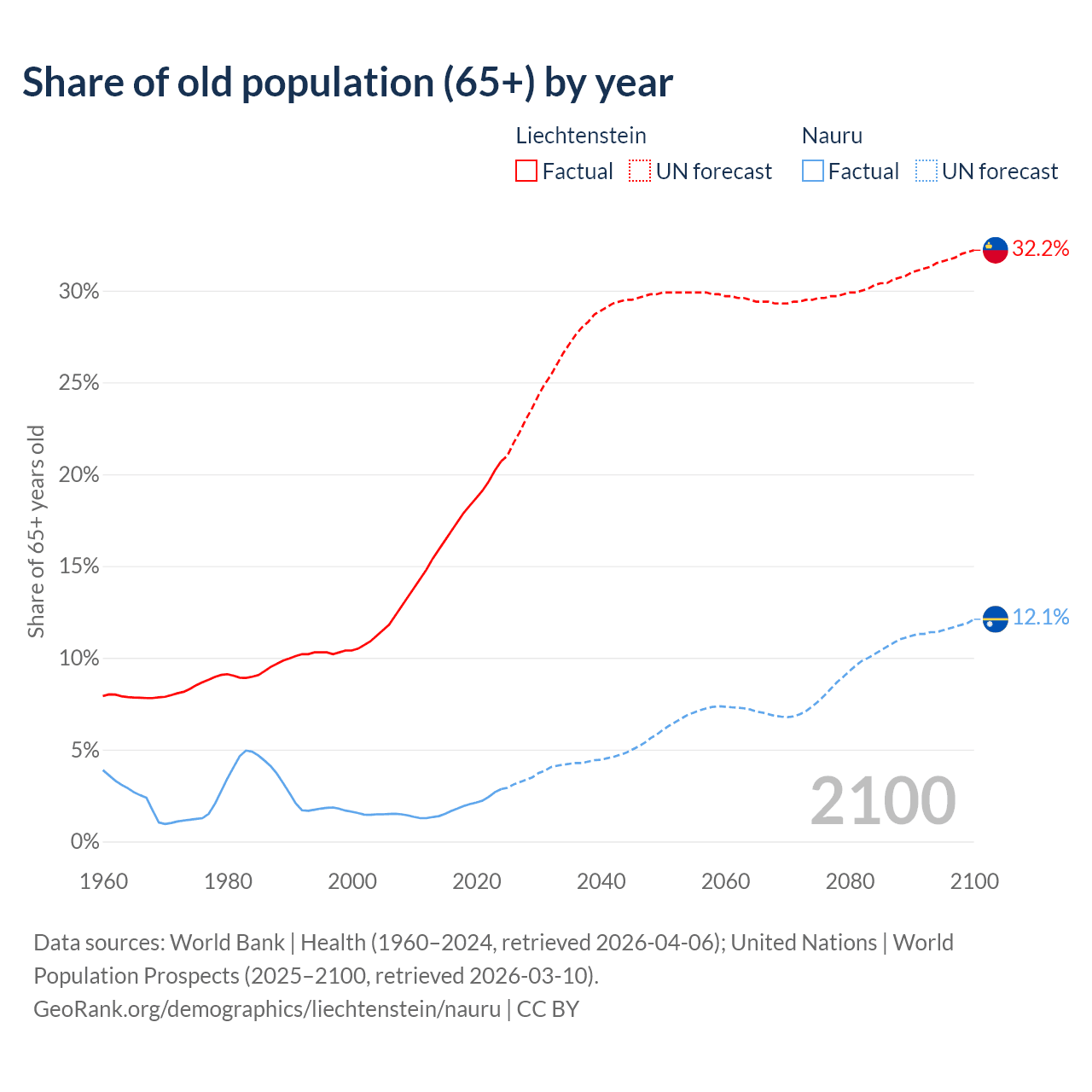 The share of older people aged 65 and over is 20.7% in Liechtenstein and 2.85% in Nauru. Life expectancy in Liechtenstein compared to Nauru .