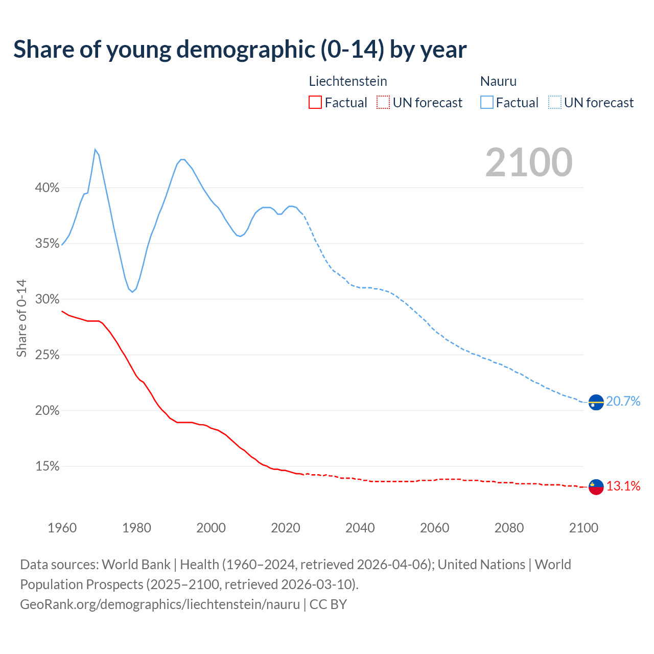 - The share of young demographic (0-15 years old) in Liechtenstein is 14.3% vs 37.8% in Nauru.