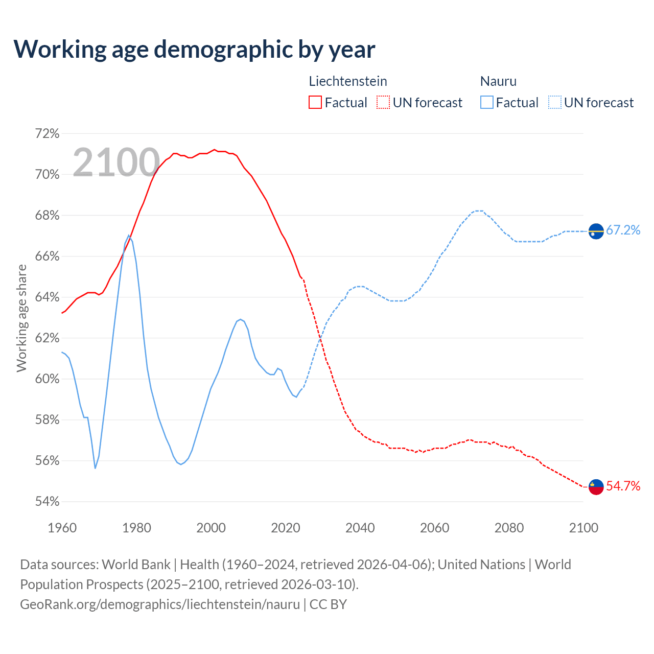 - Liechtenstein has 26.7K working age adults (aged 15-64) vs 7.2K in Nauru.