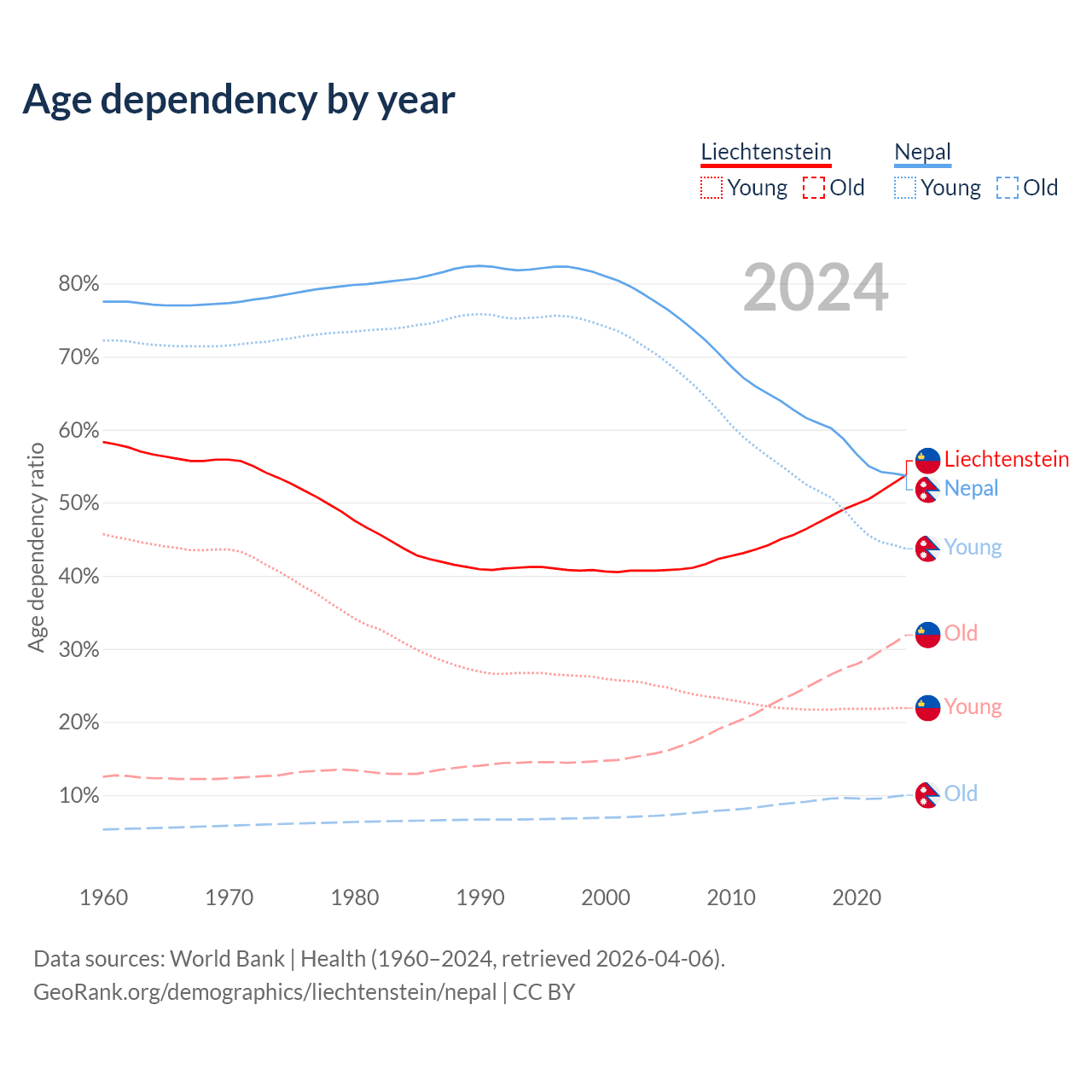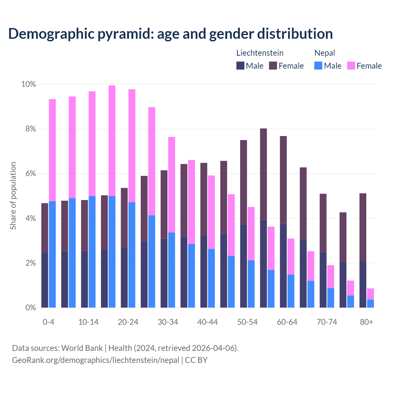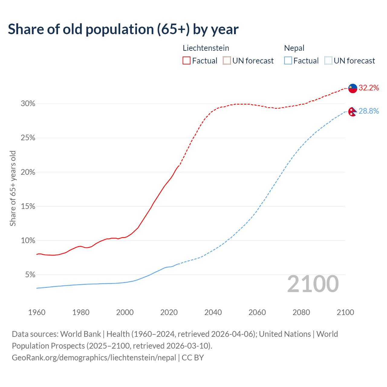 - The share of old-age demographic (65+) in Liechtenstein is 20.7% vs 6.5% in Nepal.