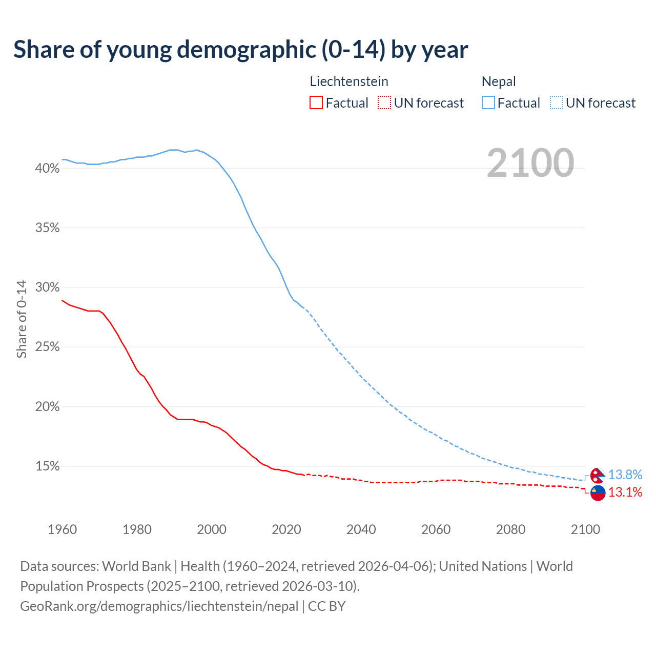 - The share of young demographic (0-15 years old) in Liechtenstein is 14.3% vs 28.4% in Nepal.