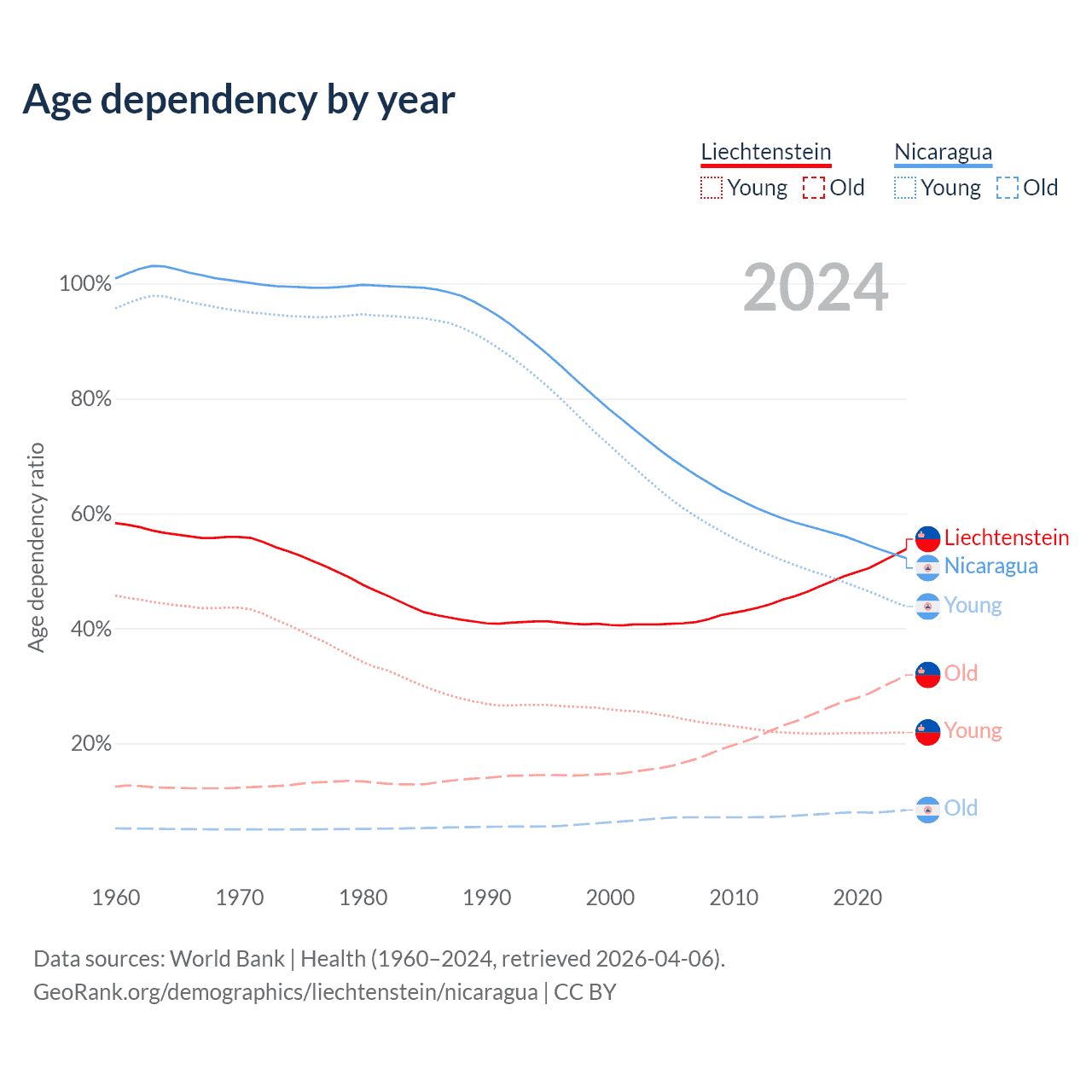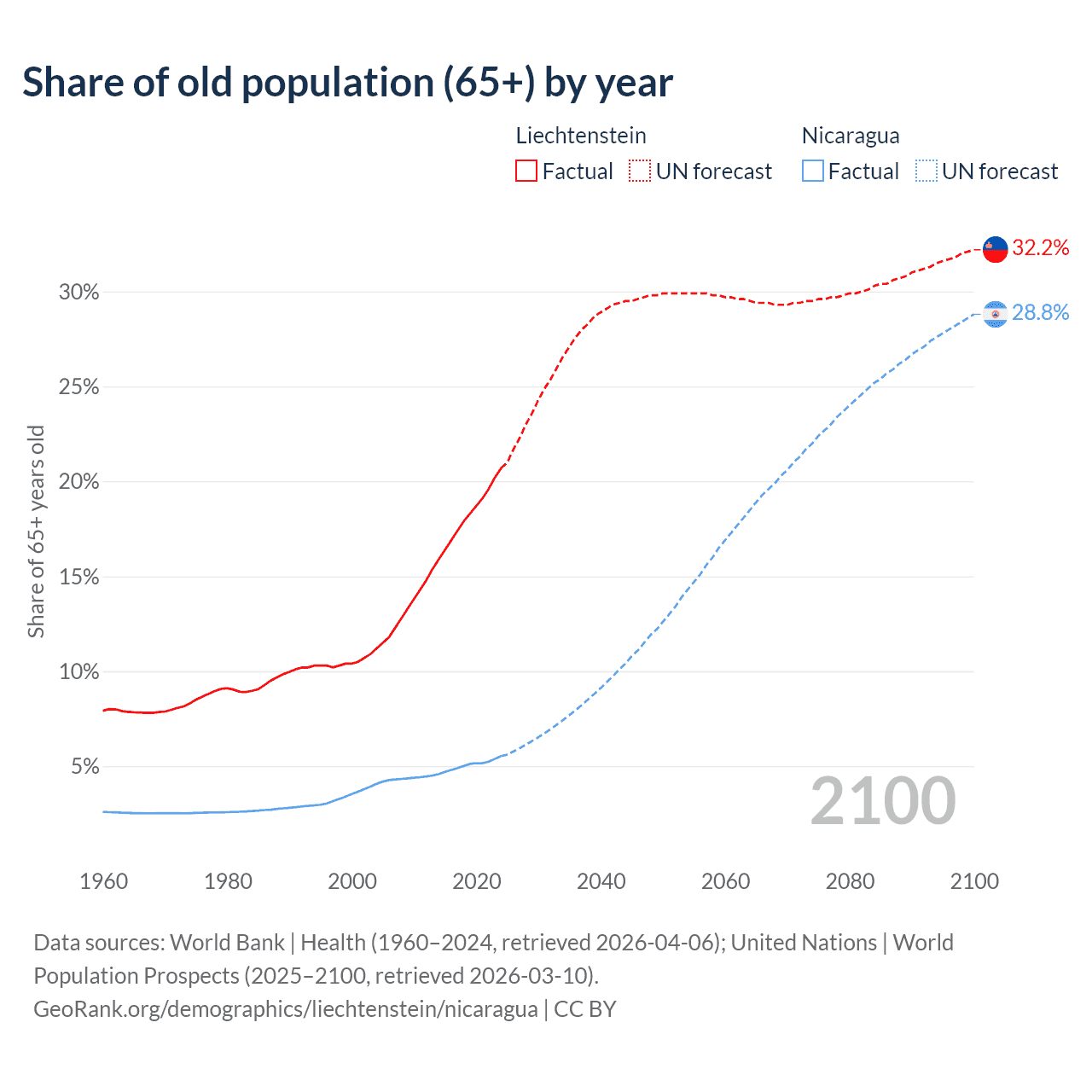 - The share of old-age demographic (65+) in Liechtenstein is 20.7% vs 5.53% in Nicaragua.