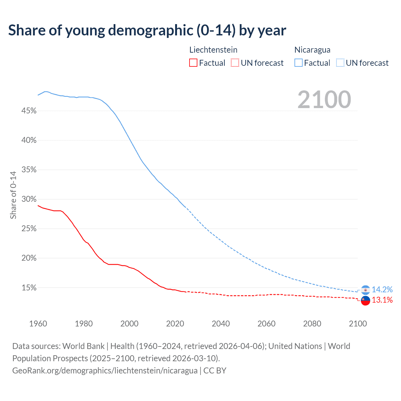 - The share of young demographic (0-15 years old) in Liechtenstein is 14.3% vs 28.8% in Nicaragua.