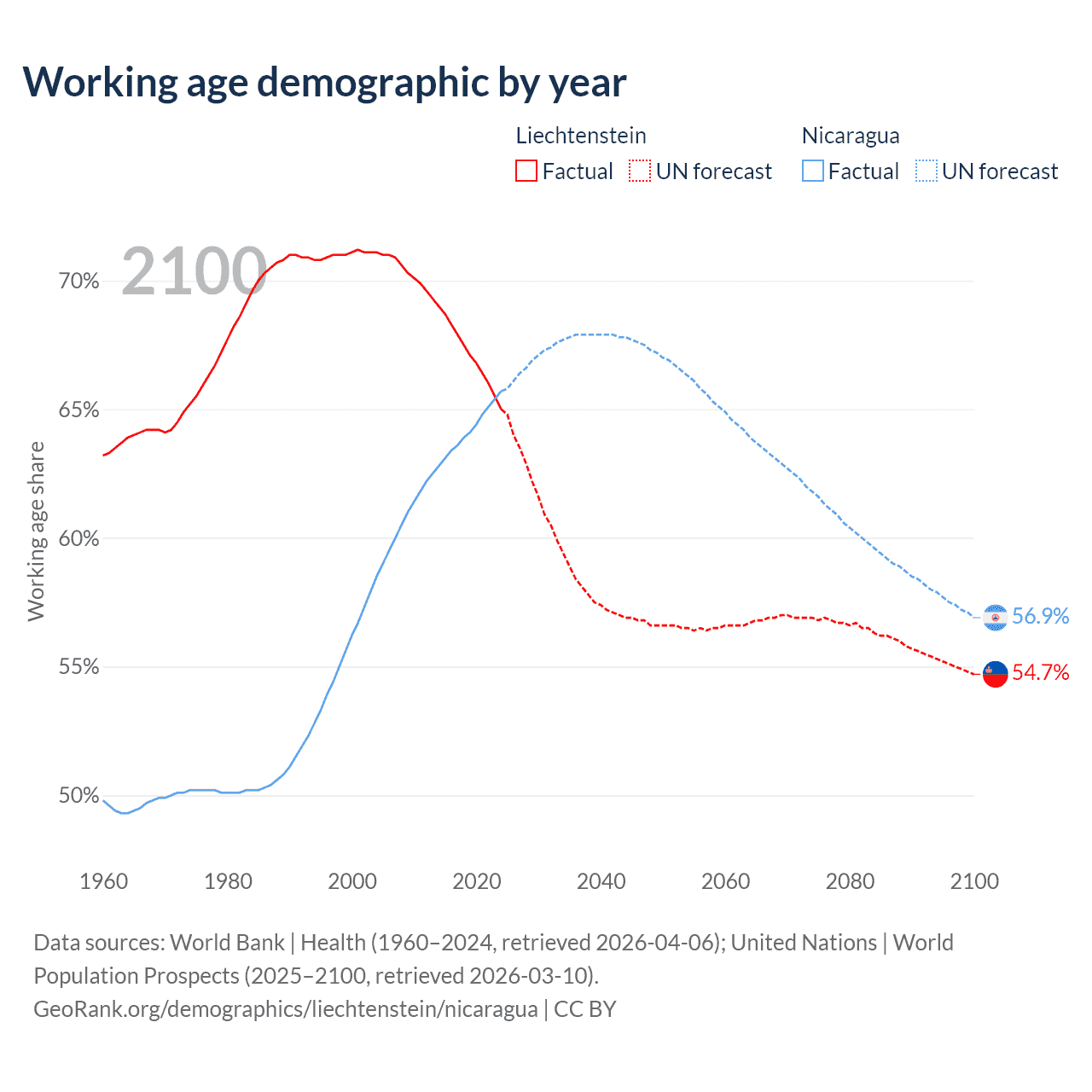 - Liechtenstein has 26.7K working age adults (aged 15-64) vs 4.68M in Nicaragua.