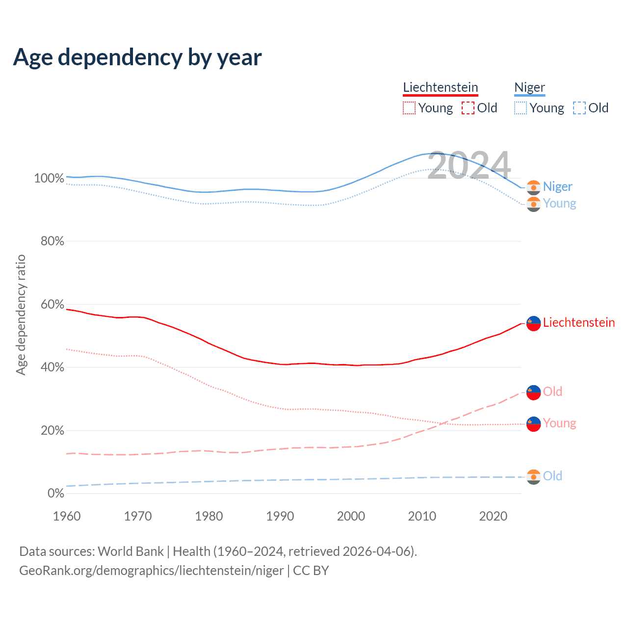- The share of old-age demographic (65+) in Liechtenstein is 20.7% vs 2.59% in Niger.