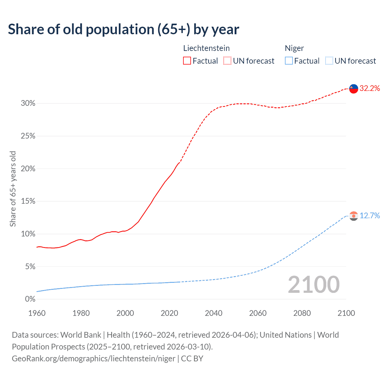 The share of older people aged 65 and over is 20.7% in Liechtenstein and 2.59% in Niger. Life expectancy in Liechtenstein compared to Niger .