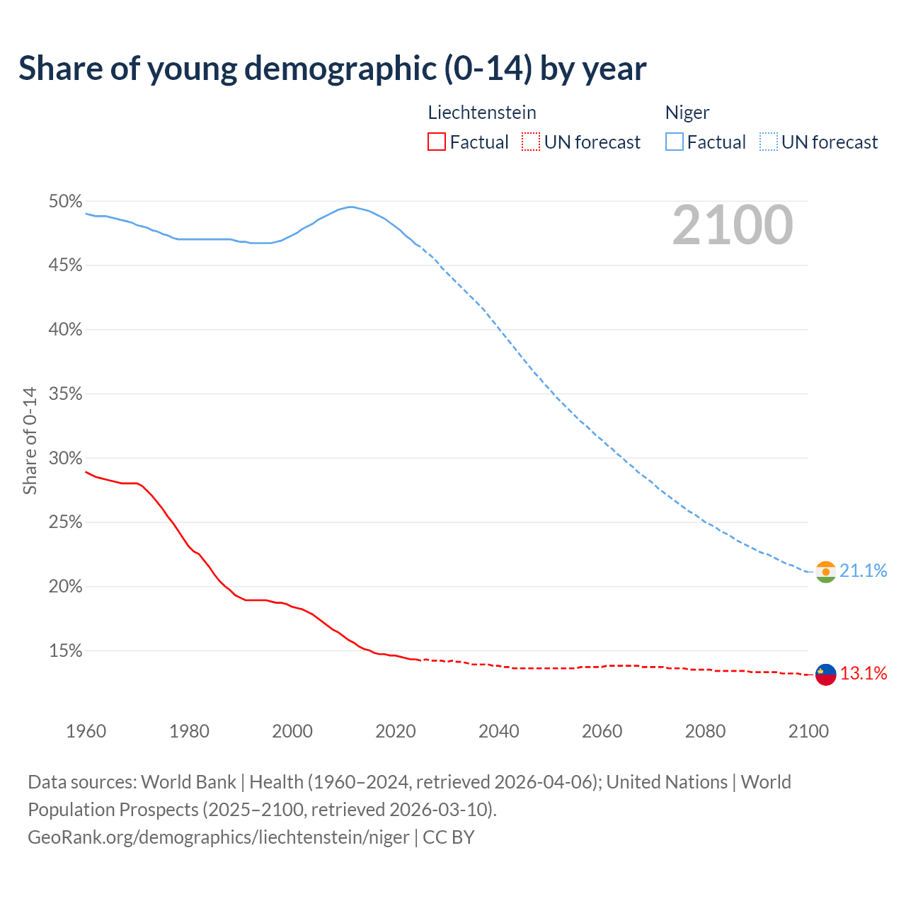 - The share of young demographic (0-15 years old) in Liechtenstein is 14.3% vs 46.6% in Niger.