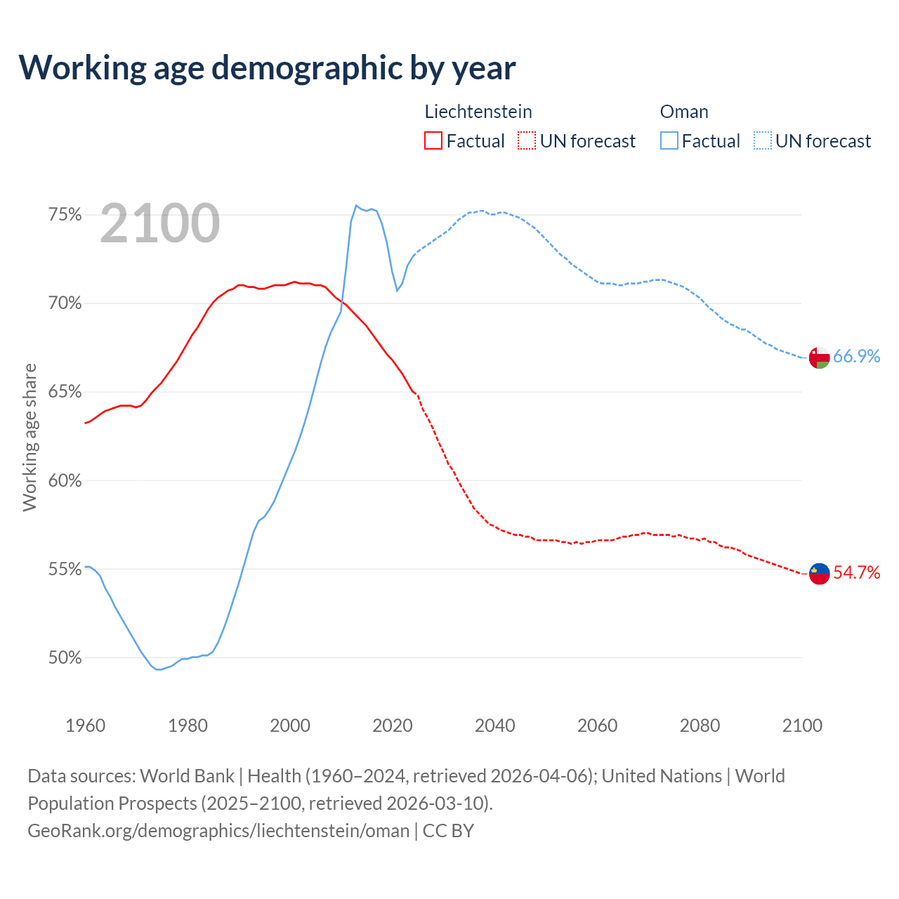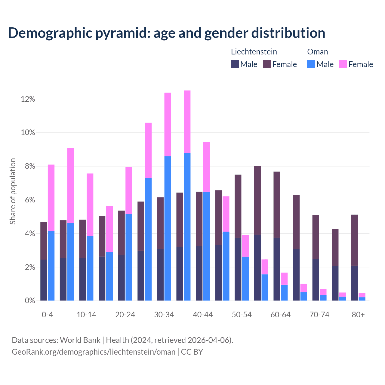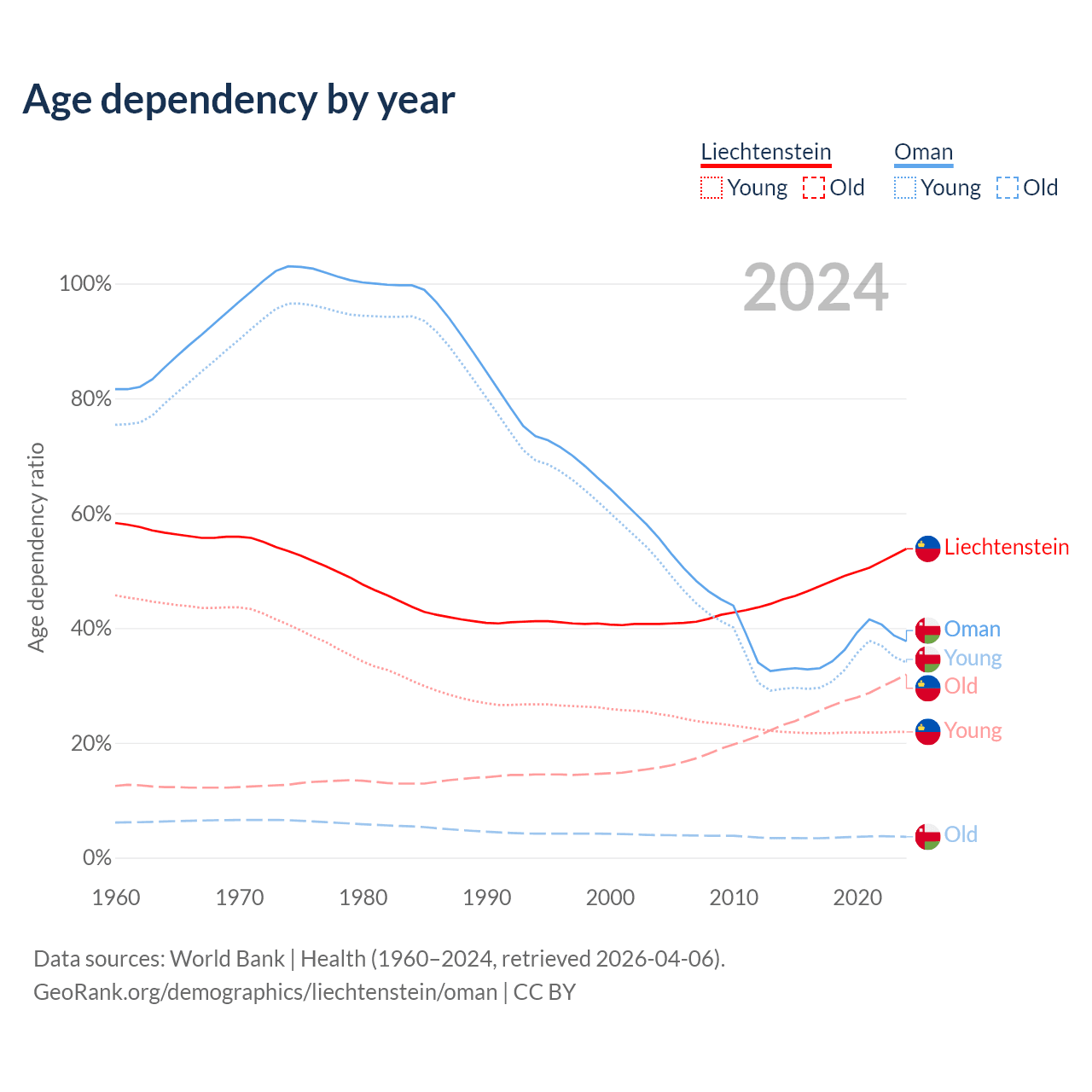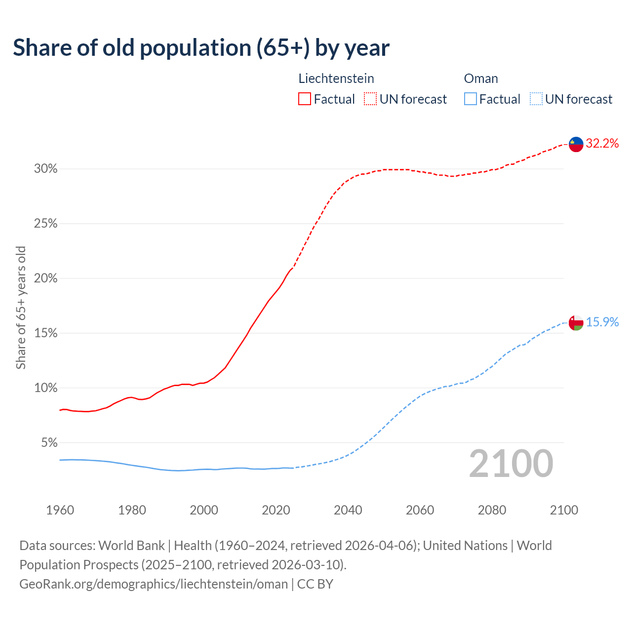 - The share of old-age demographic (65+) in Liechtenstein is 20.7% vs 2.64% in Oman.
