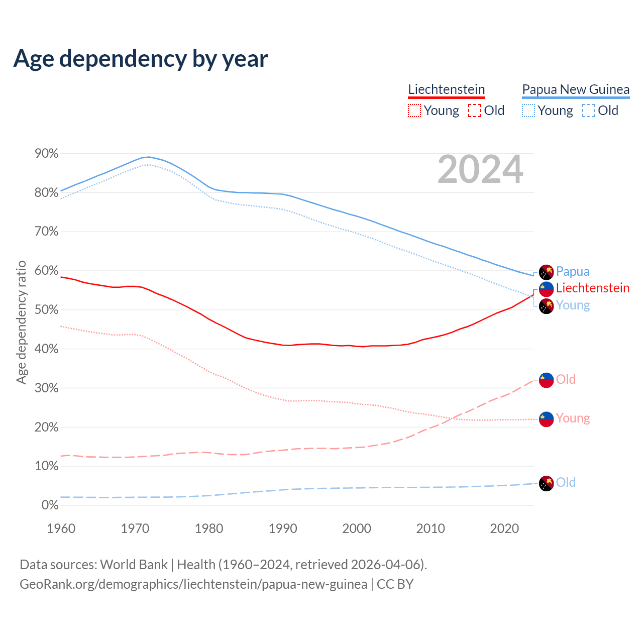 - The share of old-age demographic (65+) in Liechtenstein is 20.7% vs 3.46% in Papua New Guinea.