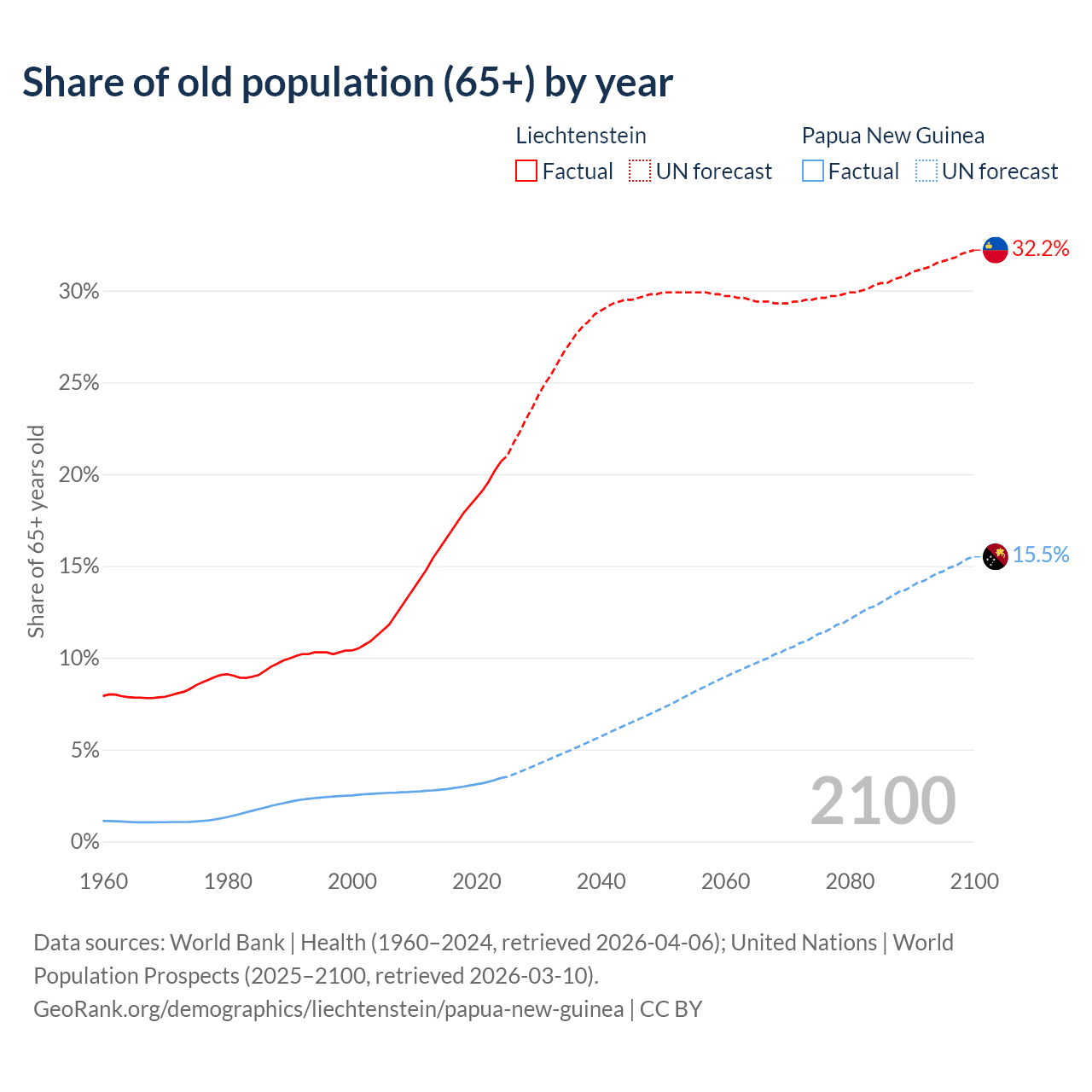 The share of older people aged 65 and over is 20.7% in Liechtenstein and 3.46% in Papua New Guinea. Life expectancy in Liechtenstein compared to Papua New Guinea .