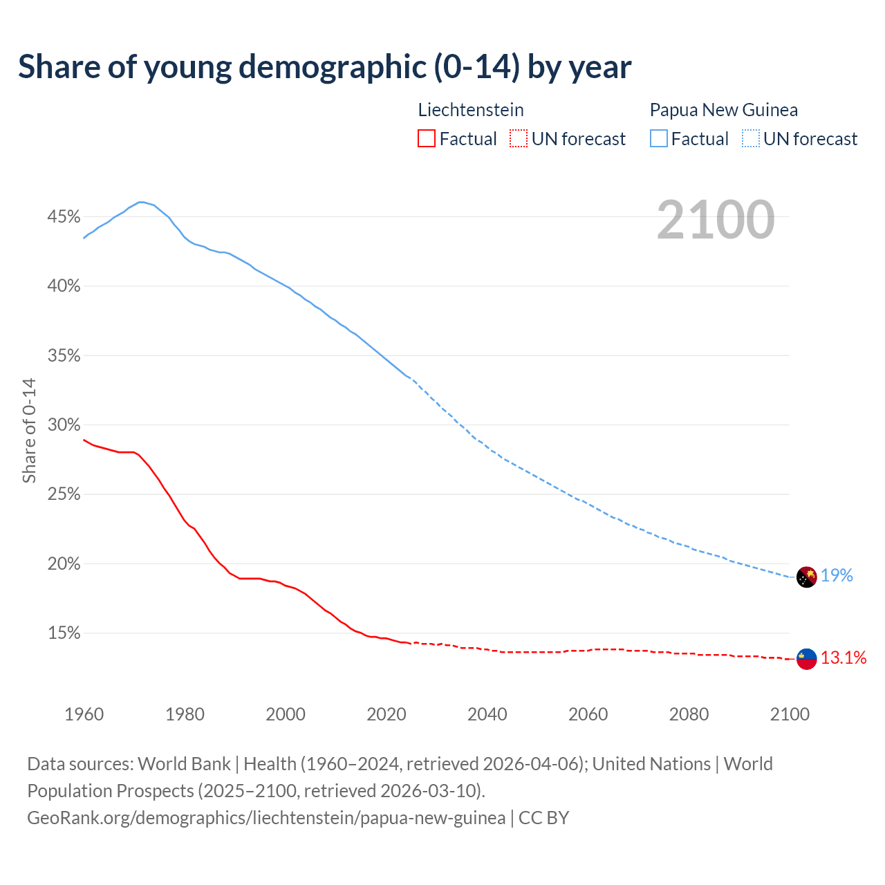- The share of young demographic (0-15 years old) in Liechtenstein is 14.3% vs 33.5% in Papua New Guinea.