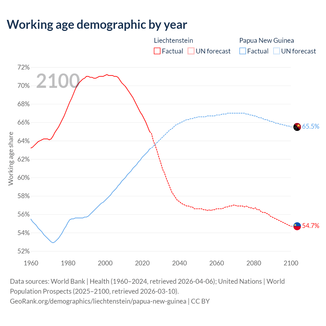 - Liechtenstein has 26.7K working age adults (aged 15-64) vs 6.94M in Papua New Guinea.