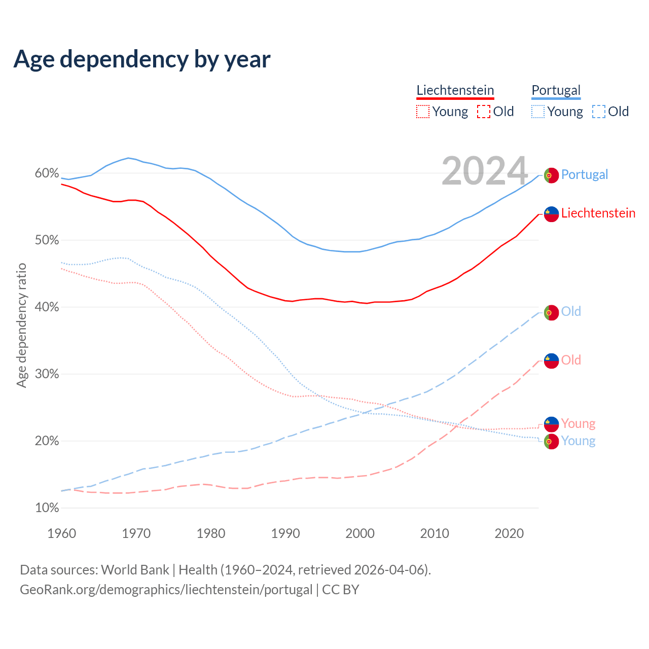 Data sources: World Bank | Health (1960–2024, retrieved 2026-04-06); U.S. Census Bureau (1960–2024, retrieved 2026-02-08).