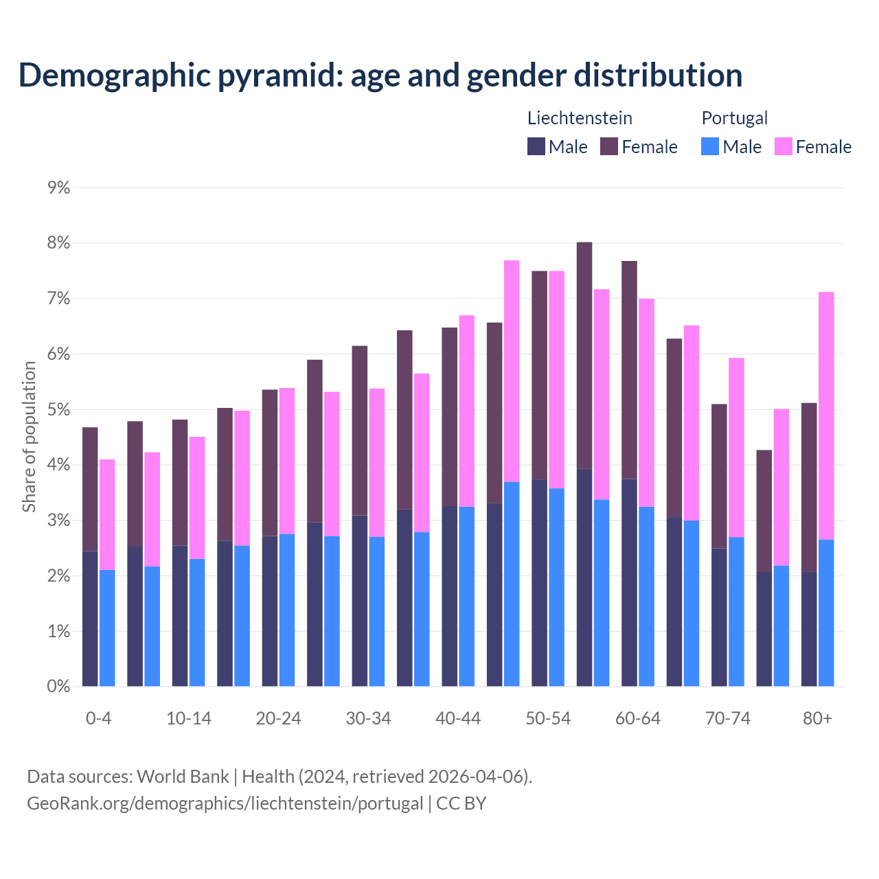 - The share of old-age demographic (65+) in Liechtenstein is 20.7% vs 24.5% in Portugal.
