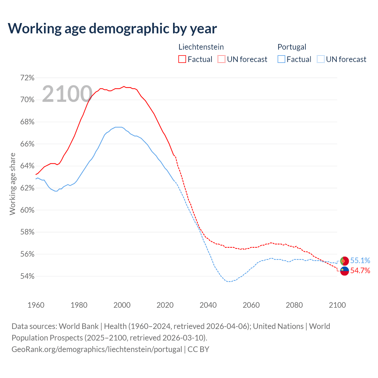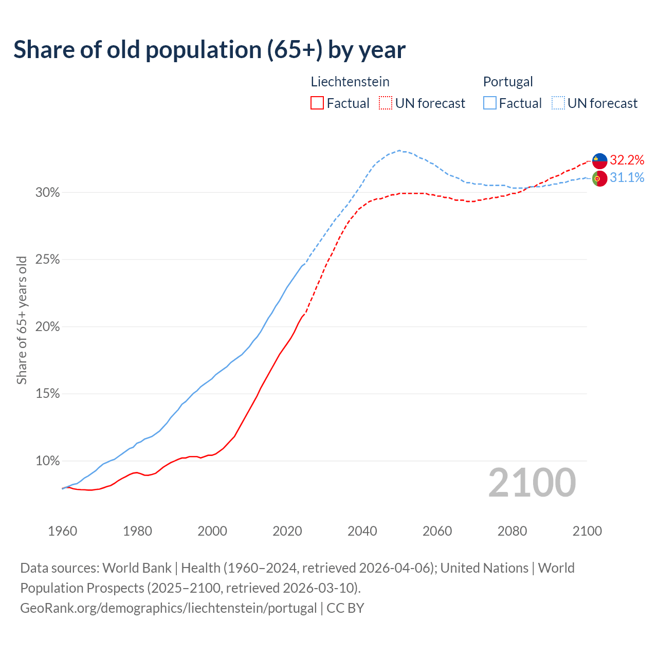 Median age Liechtenstein vs Portugal, 1960-2100