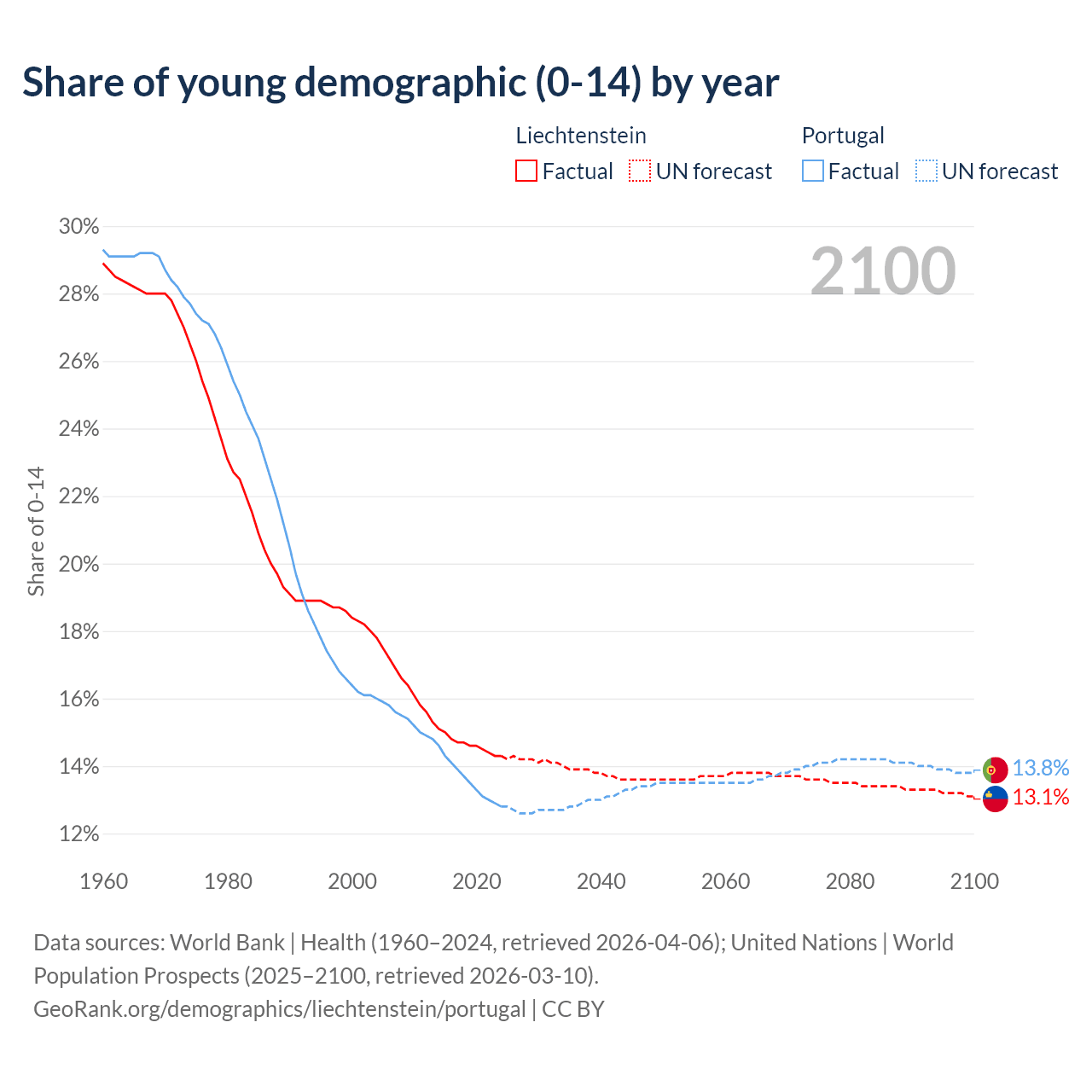 - The share of young demographic (0-15 years old) in Liechtenstein is 14.3% vs 12.8% in Portugal.