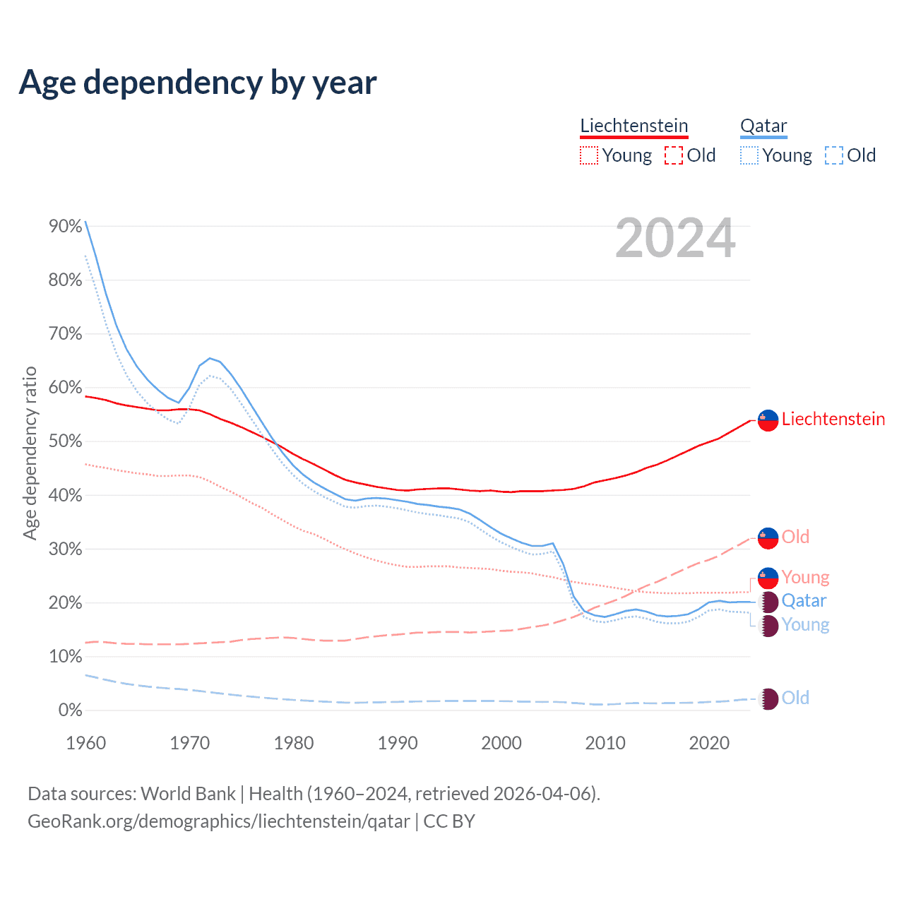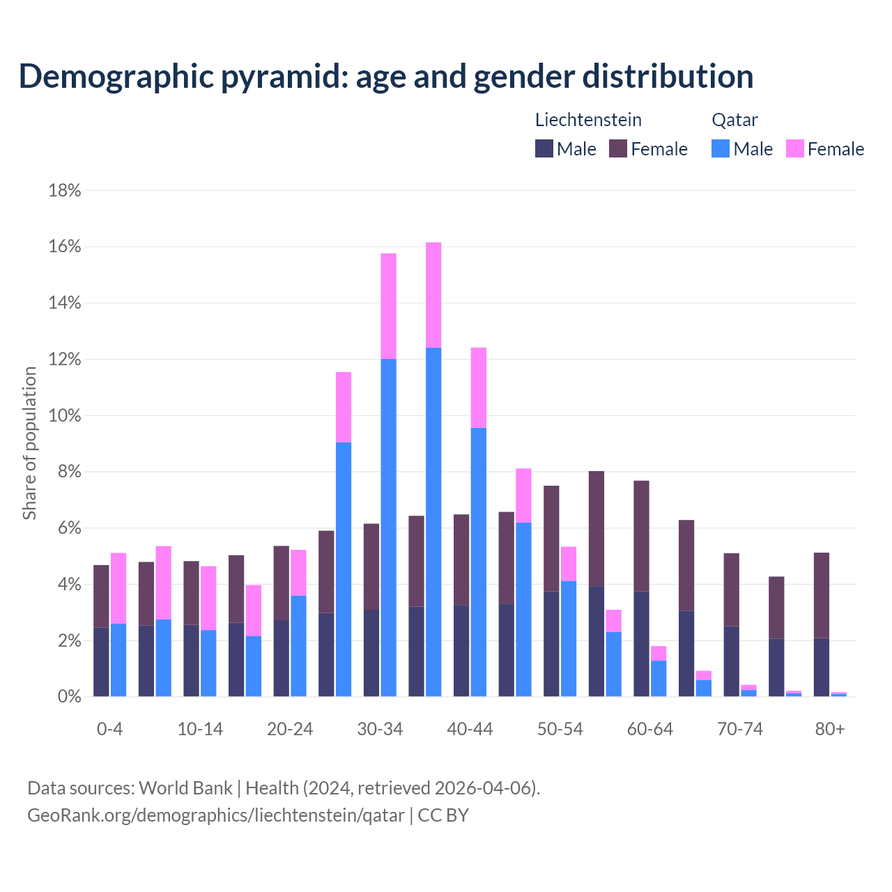 - Liechtenstein is ranked 13/196 by median age (oldest to youngest) vs 78/196 for Qatar.