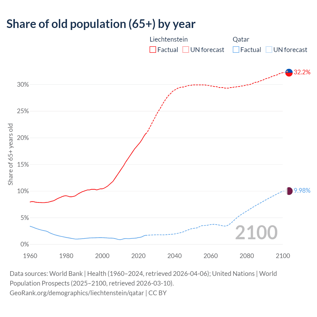 The share of older people aged 65 and over is 20.7% in Liechtenstein and 1.68% in Qatar. Life expectancy in Liechtenstein compared to Qatar .
