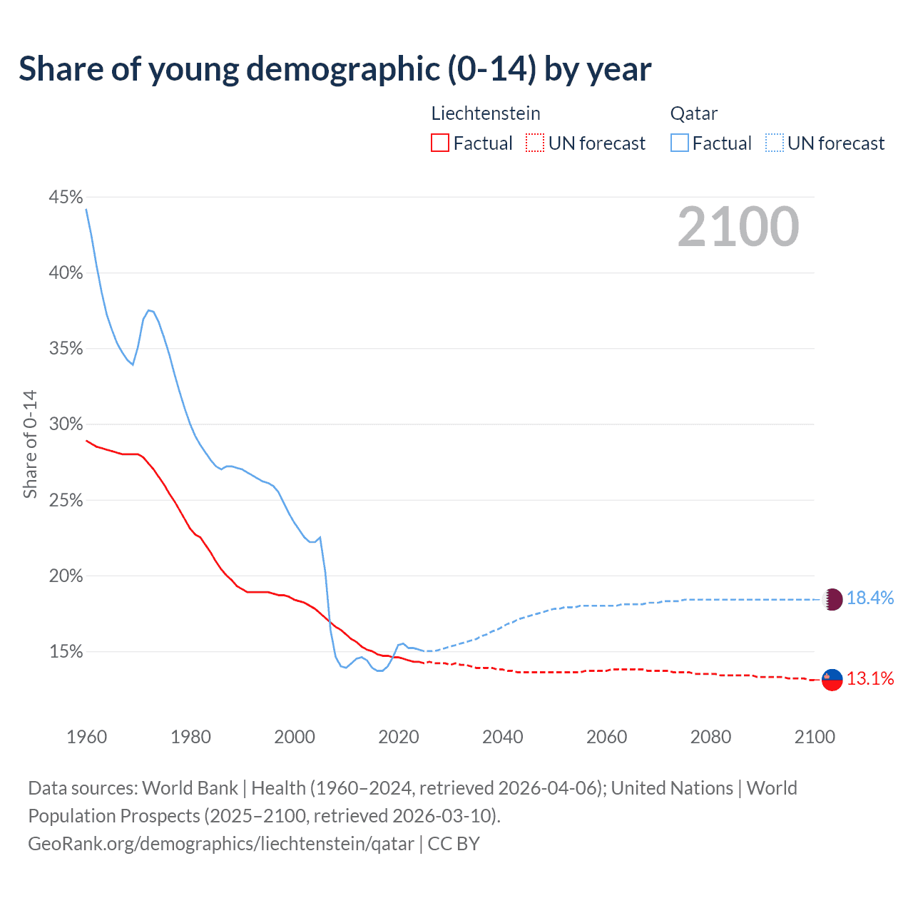 - The share of young demographic (0-15 years old) in Liechtenstein is 14.3% vs 15.1% in Qatar.