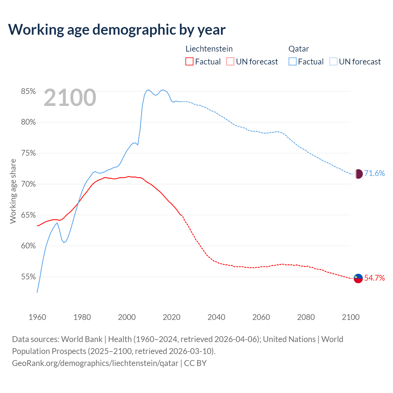 - Liechtenstein has 26.7K working age adults (aged 15-64) vs 2.5M in Qatar.