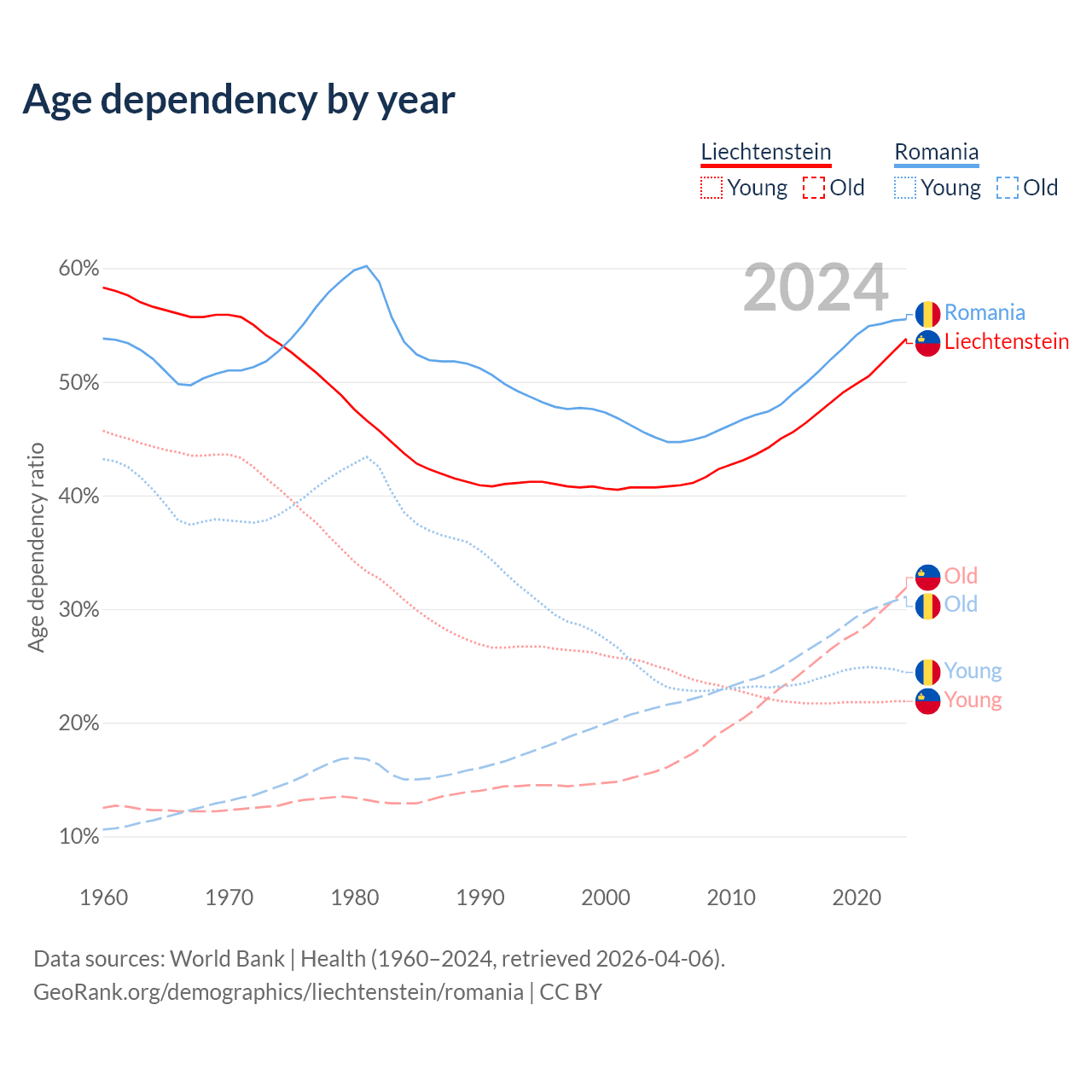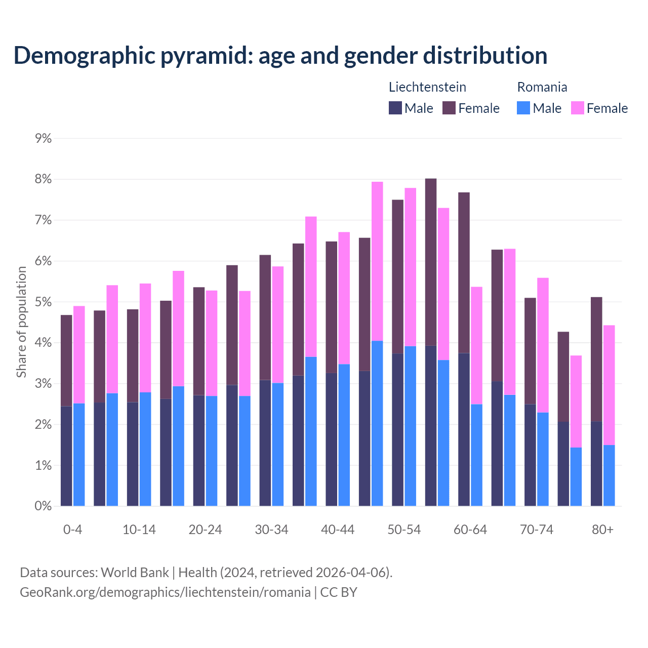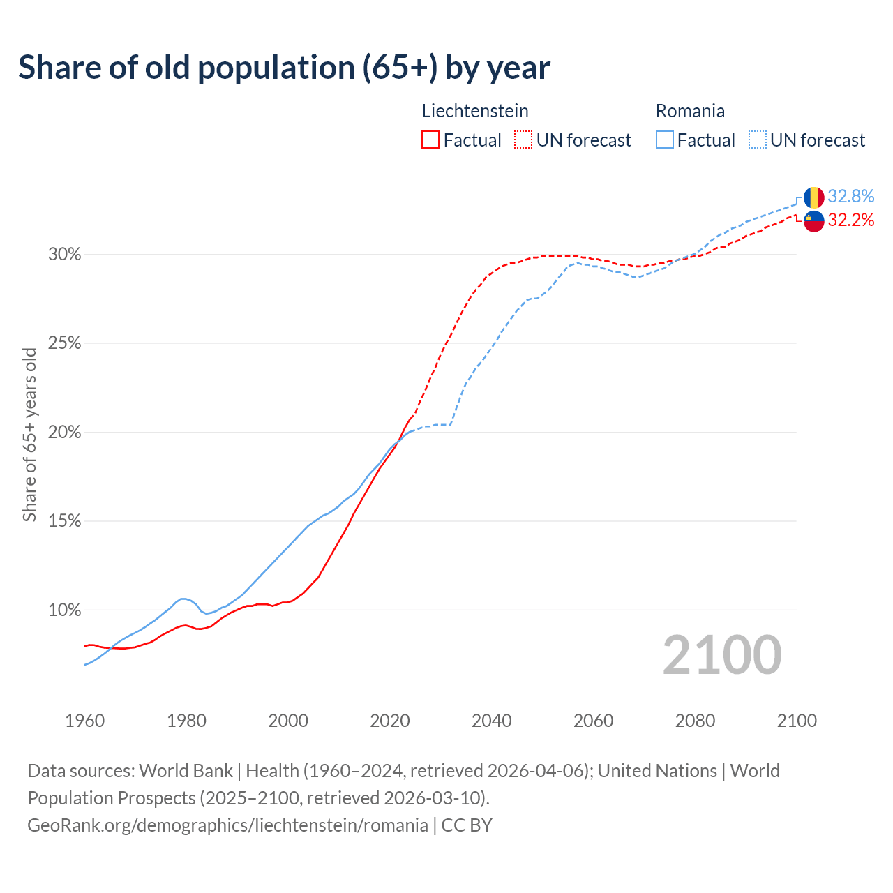 The share of older people aged 65 and over is 20.7% in Liechtenstein and 20% in Romania. Life expectancy in Liechtenstein compared to Romania .
