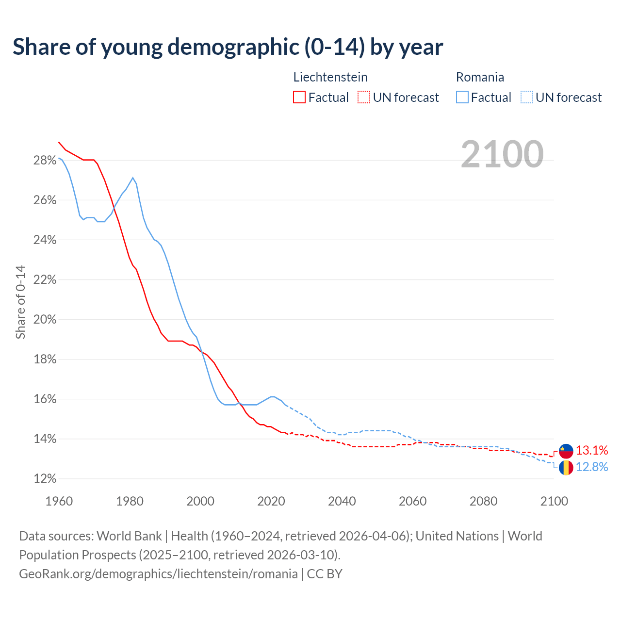- The share of young demographic (0-15 years old) in Liechtenstein is 14.3% vs 15.7% in Romania.