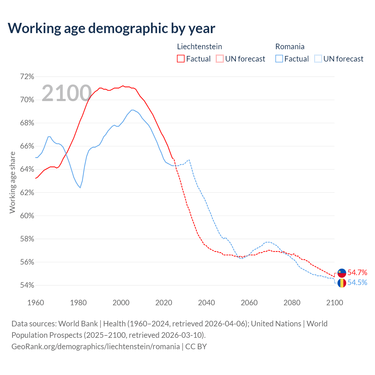 - Liechtenstein has 26.7K working age adults (aged 15-64) vs 12.1M in Romania.