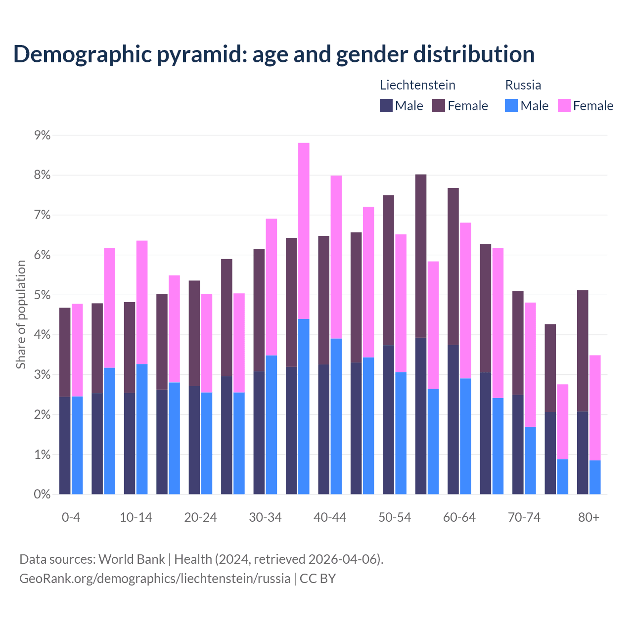 - Liechtenstein is ranked 13/196 by median age (oldest to youngest) vs 42/196 for Russia.