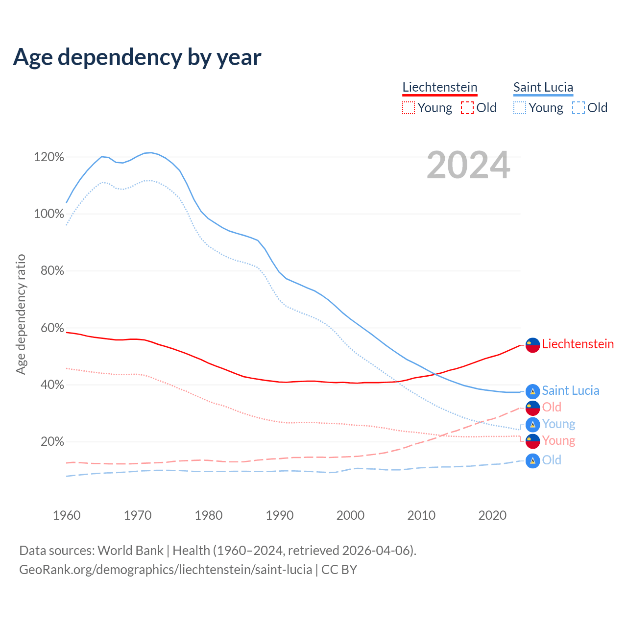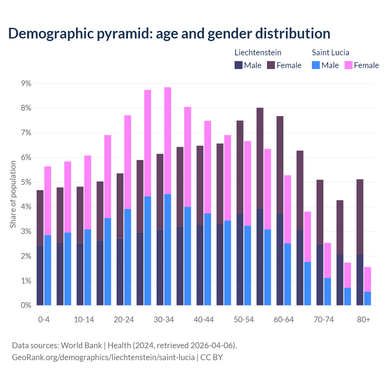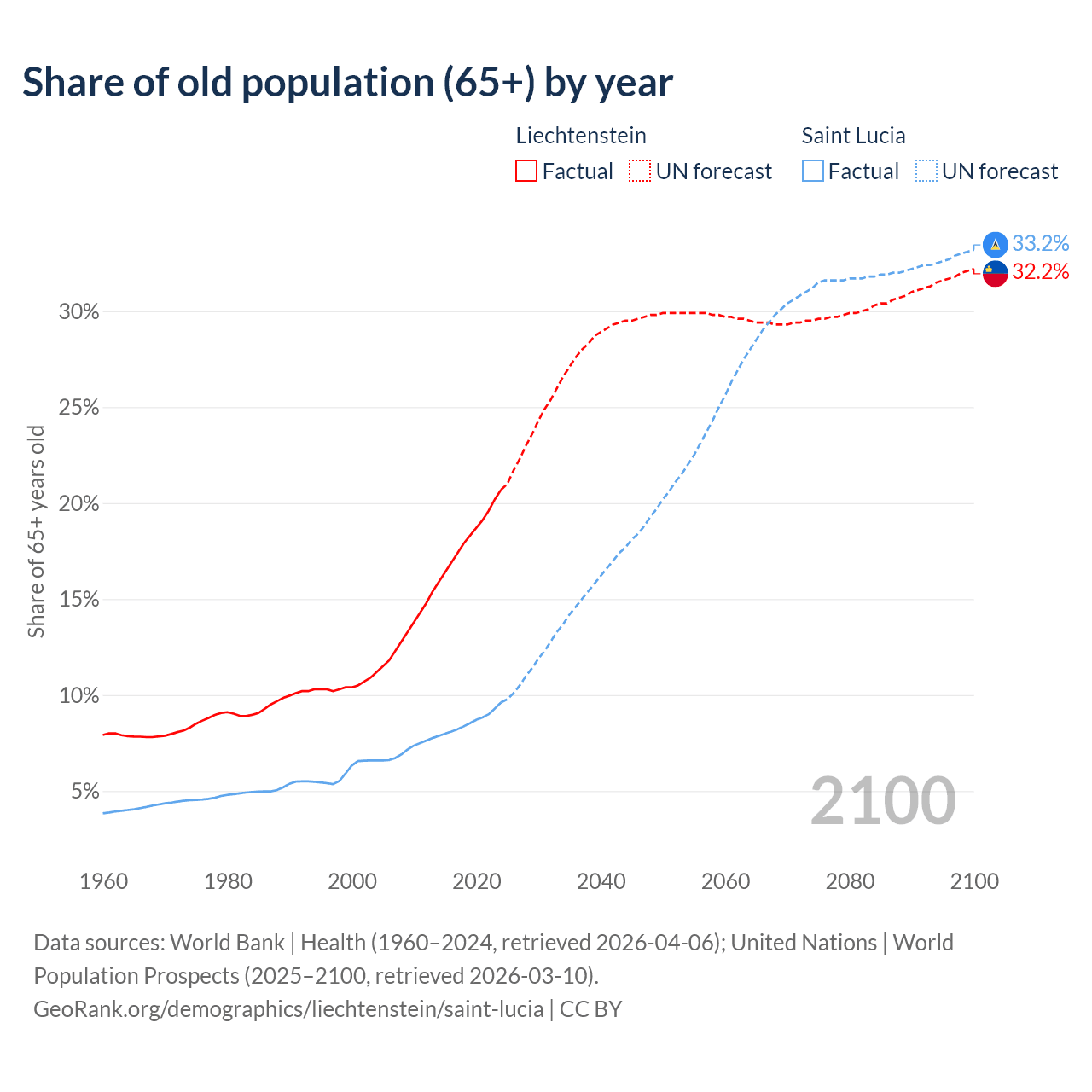 - The share of old-age demographic (65+) in Liechtenstein is 20.7% vs 9.62% in Saint Lucia.