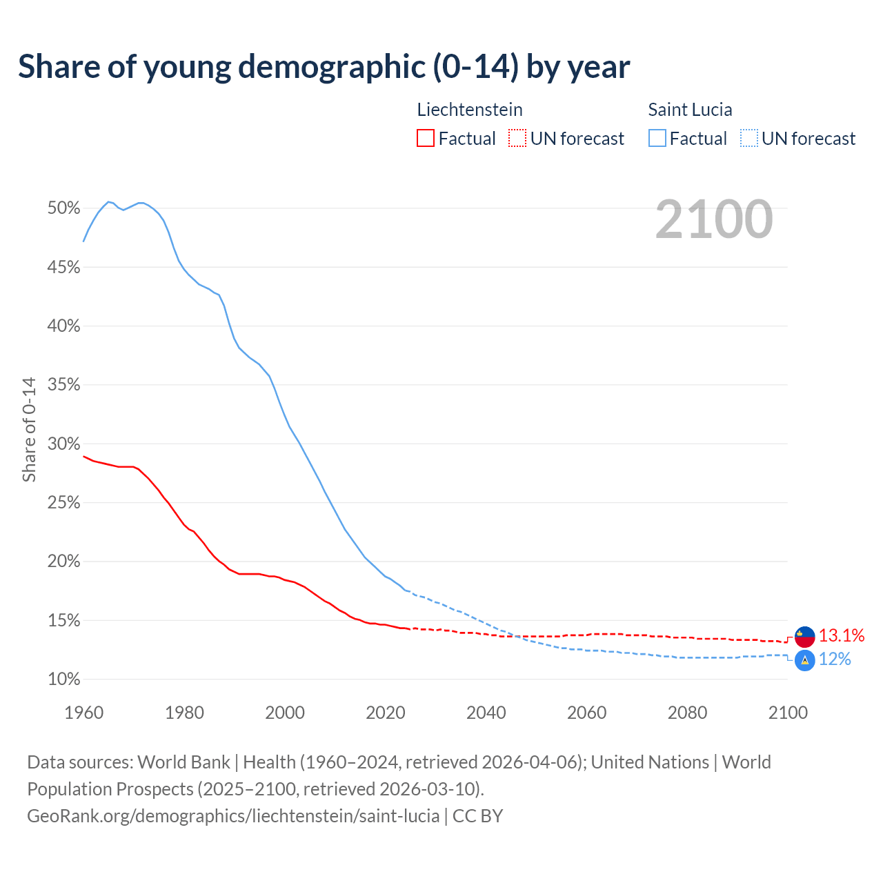 - The share of young demographic (0-15 years old) in Liechtenstein is 14.3% vs 17.5% in Saint Lucia.