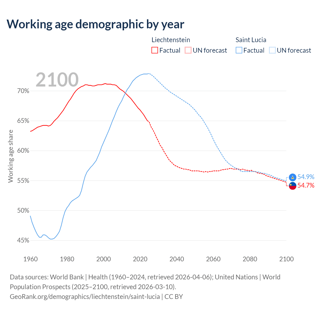 - Liechtenstein has 26.7K working age adults (aged 15-64) vs 132K in Saint Lucia.