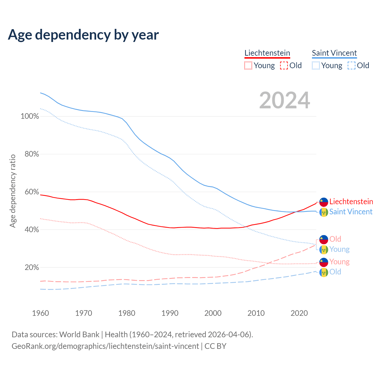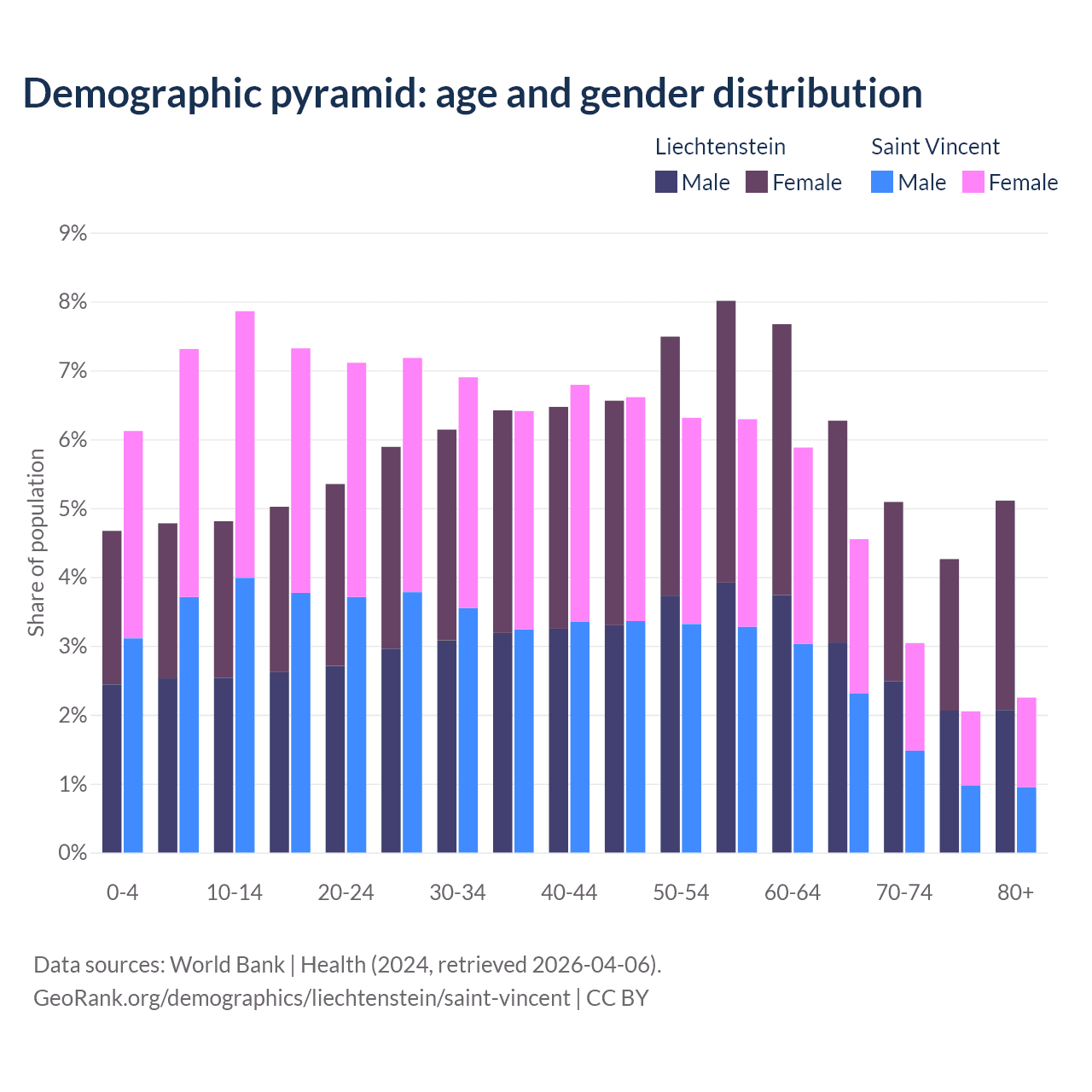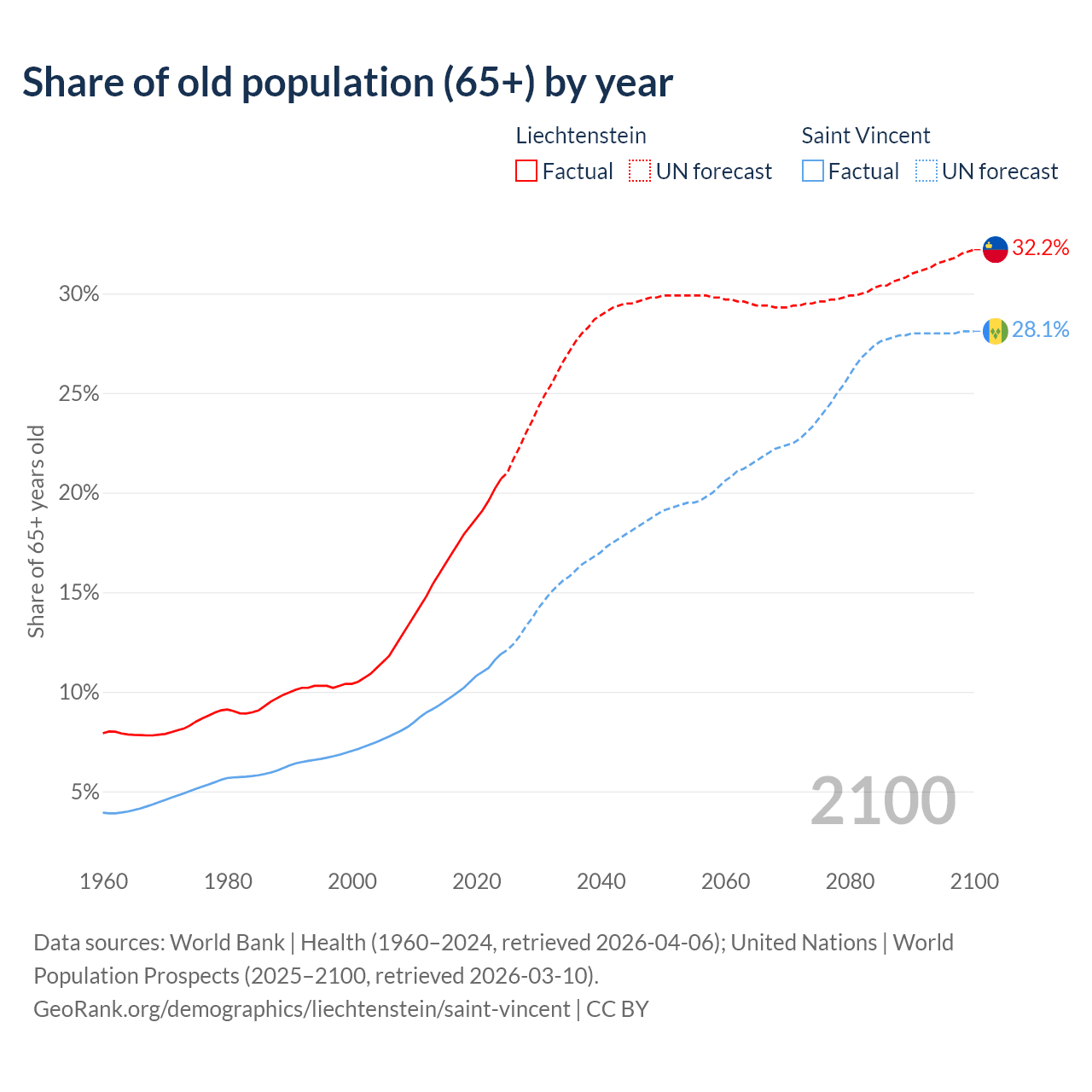 - The share of old-age demographic (65+) in Liechtenstein is 20.7% vs 11.9% in Saint Vincent.
