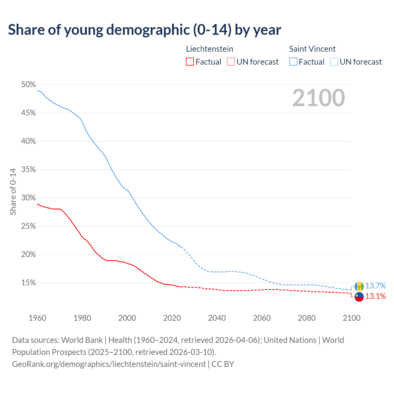 - The share of young demographic (0-15 years old) in Liechtenstein is 14.3% vs 21.3% in Saint Vincent.