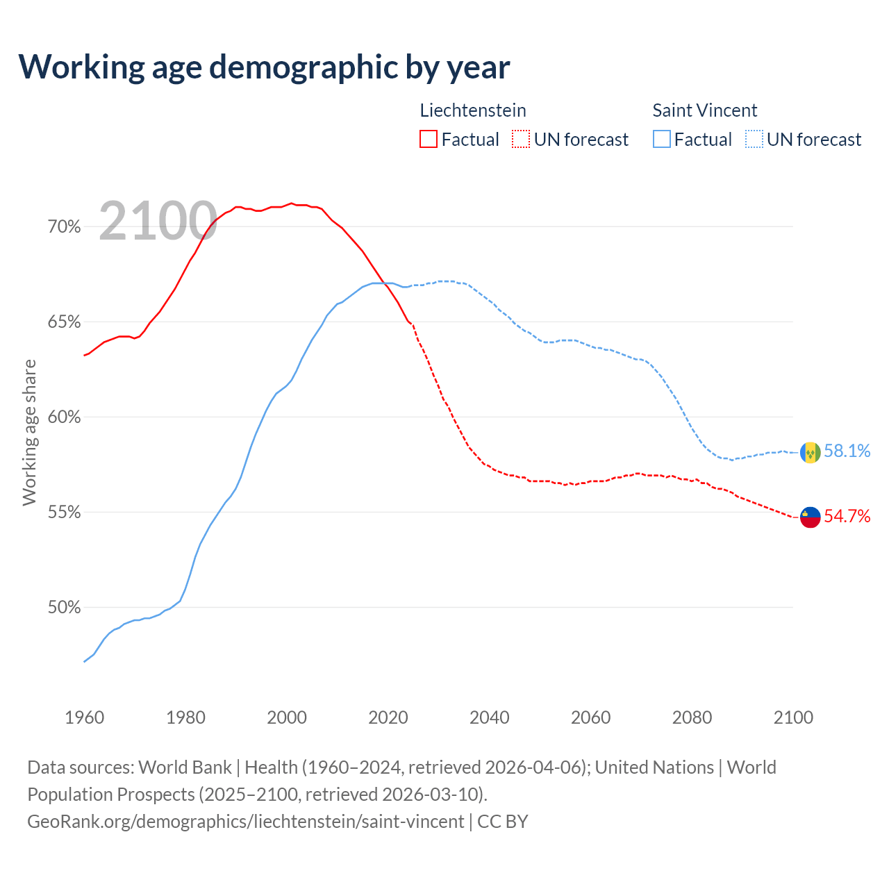 - Liechtenstein has 26.7K working age adults (aged 15-64) vs 66.3K in Saint Vincent.