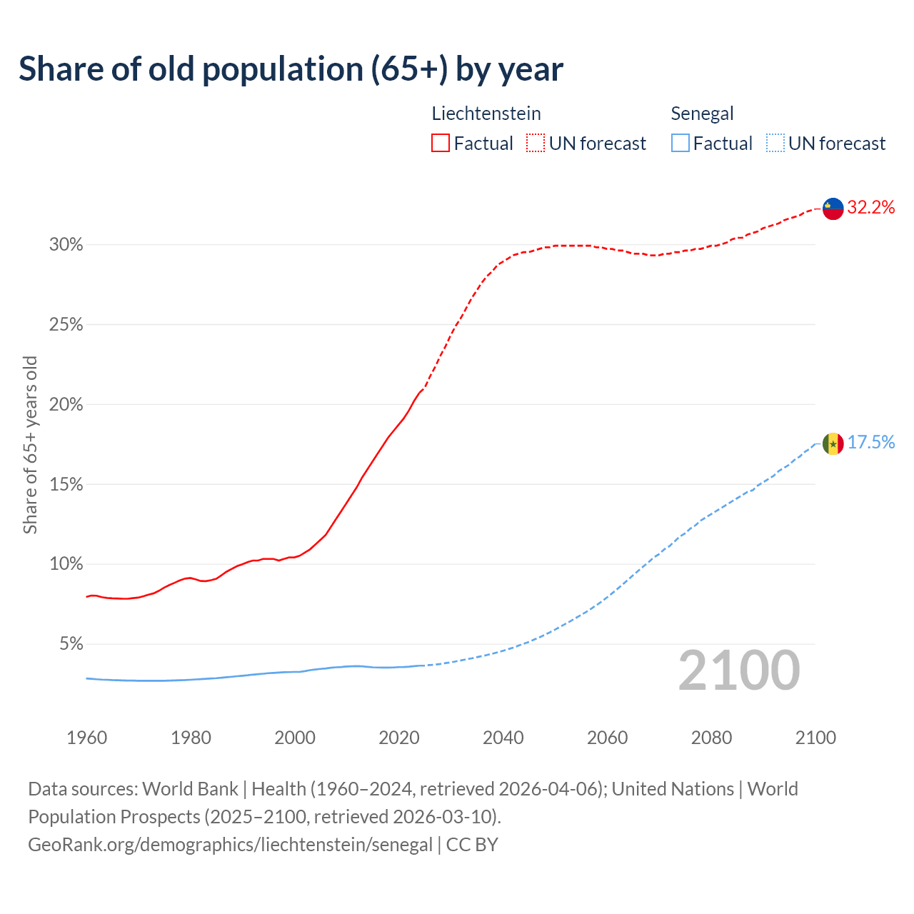 The share of older people aged 65 and over is 20.7% in Liechtenstein and 3.62% in Senegal. Life expectancy in Liechtenstein compared to Senegal .
