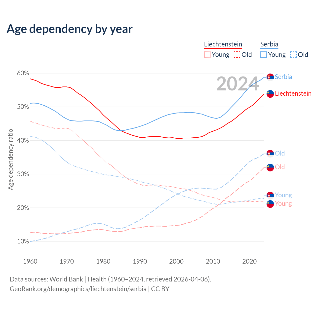 - The share of old-age demographic (65+) in Liechtenstein is 20.7% vs 22.7% in Serbia.