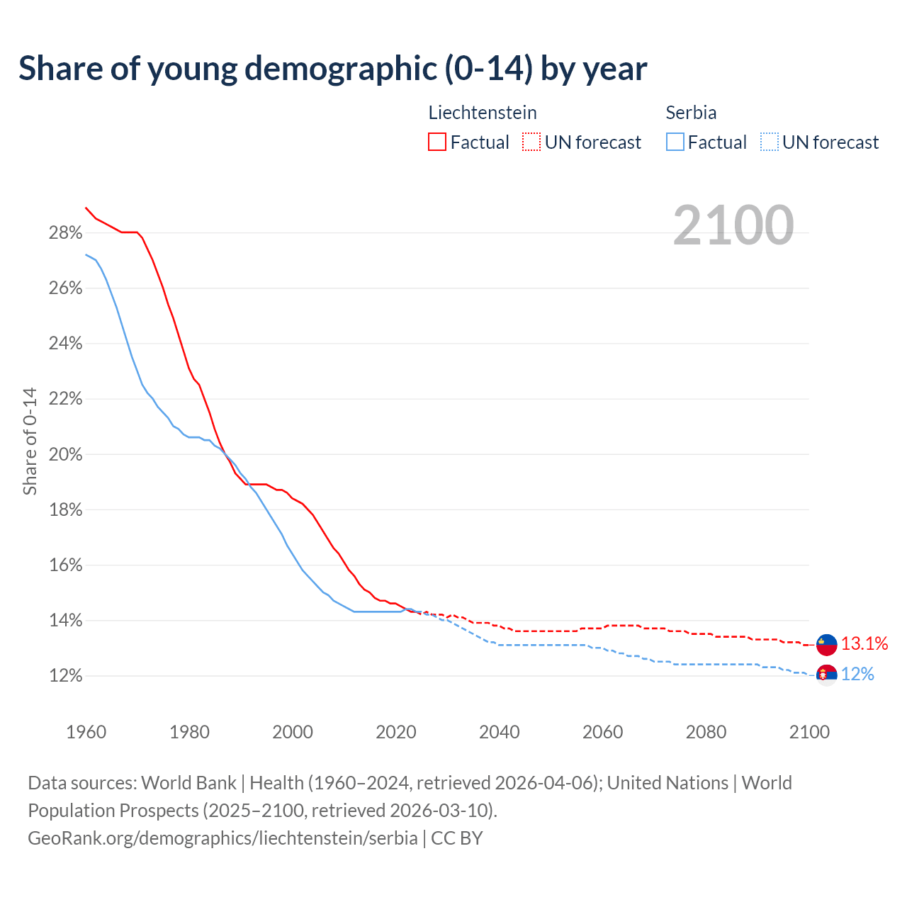 - The share of young demographic (0-15 years old) in Liechtenstein is 14.3% vs 14.3% in Serbia.