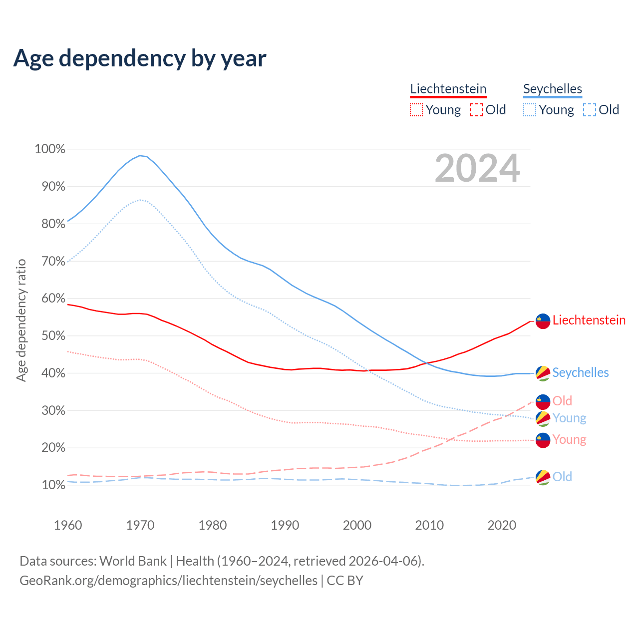 - The share of old-age demographic (65+) in Liechtenstein is 20.7% vs 8.54% in the Seychelles.