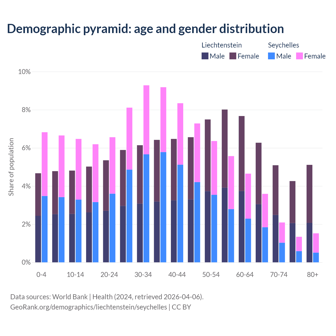 - As of 2026, the population of Liechtenstein is 41K vs 126K in the Seychelles - 3.08 times difference.