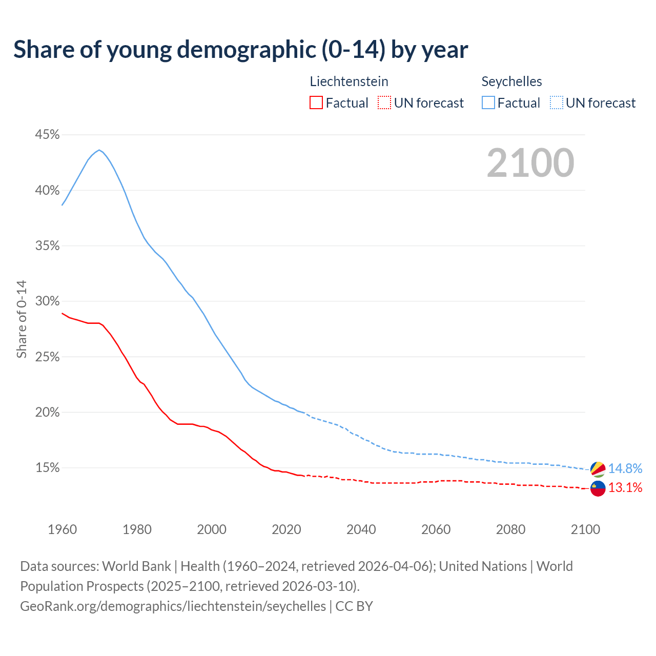 - The share of young demographic (0-15 years old) in Liechtenstein is 14.3% vs 20% in the Seychelles.