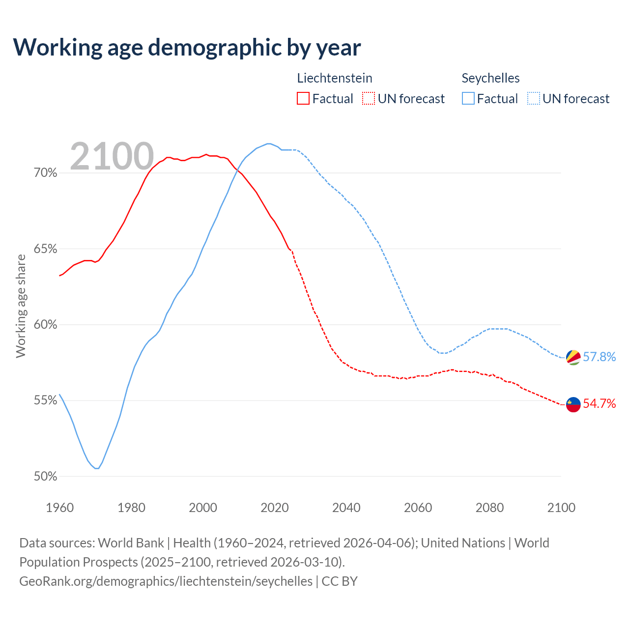 - Liechtenstein has 26.7K working age adults (aged 15-64) vs 90.3K in the Seychelles.
