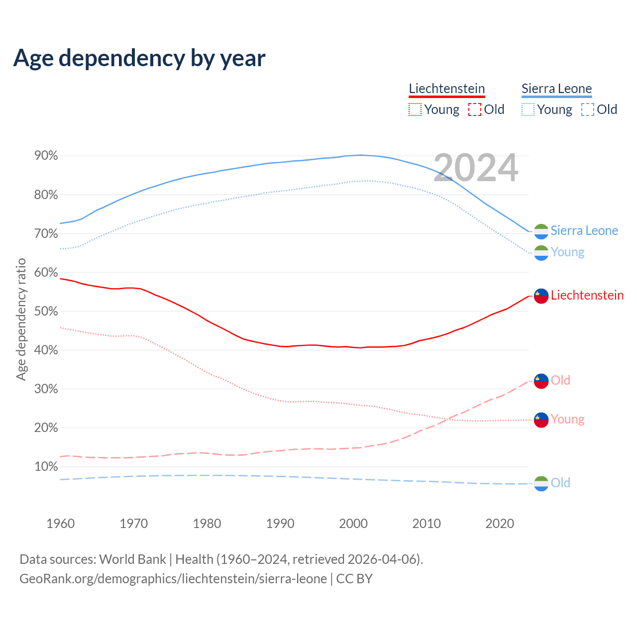 - The share of old-age demographic (65+) in Liechtenstein is 20.7% vs 3.24% in Sierra Leone.