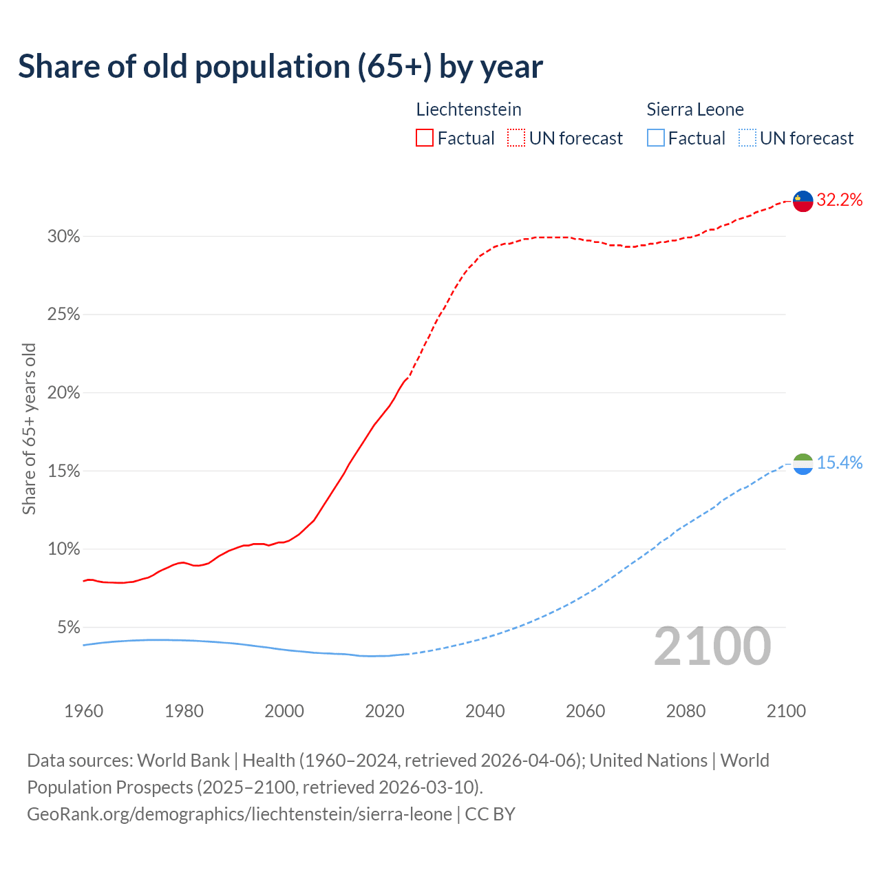 The share of older people aged 65 and over is 20.7% in Liechtenstein and 3.24% in Sierra Leone. Life expectancy in Liechtenstein compared to Sierra Leone .