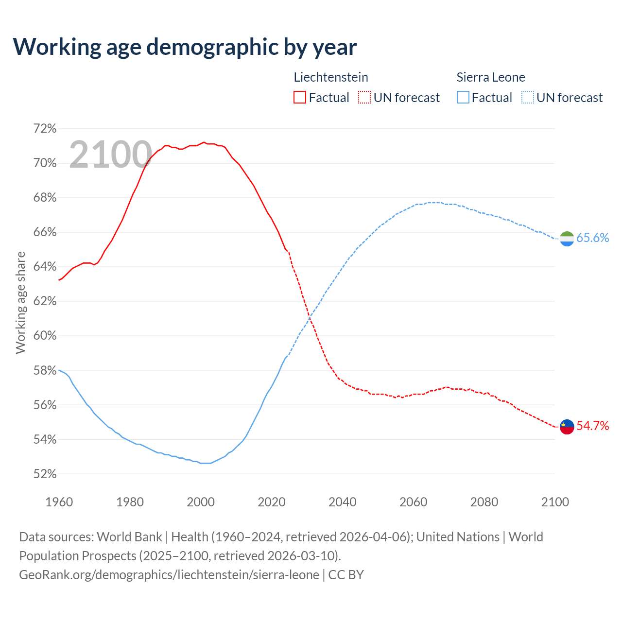- Liechtenstein has 26.7K working age adults (aged 15-64) vs 5.31M in Sierra Leone.