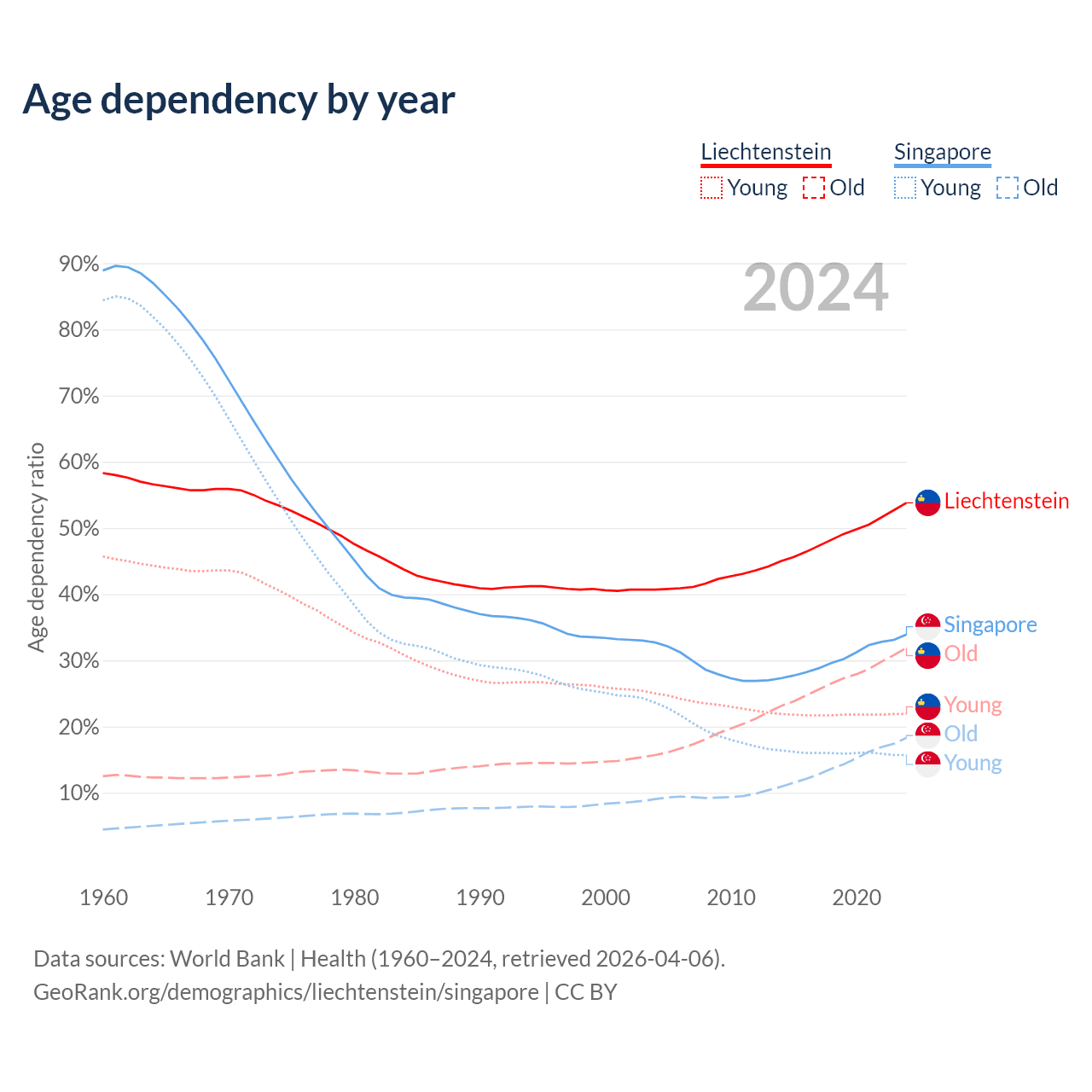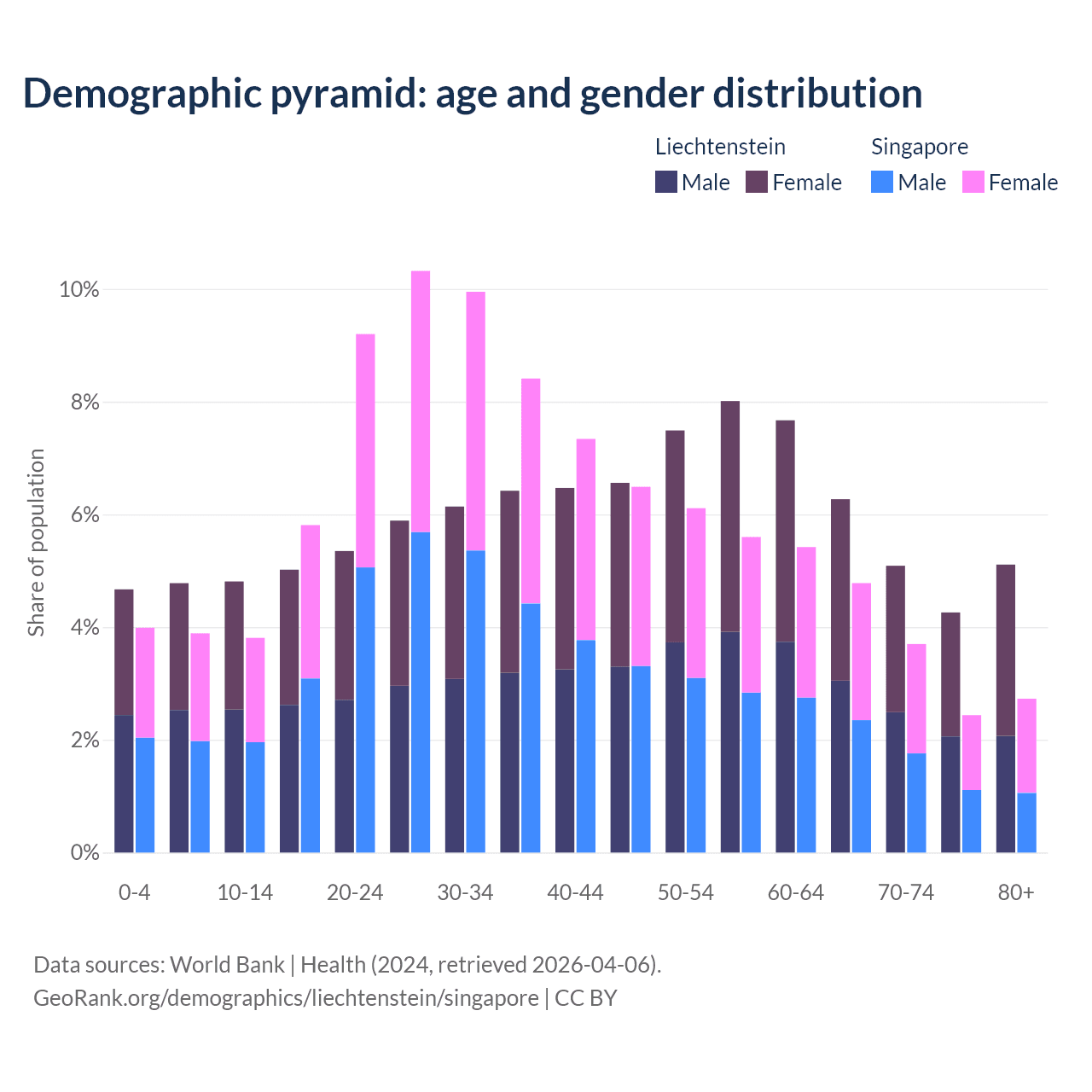 The share of older people aged 65 and over is 20.7% in Liechtenstein and 13.7% in Singapore. Life expectancy in Liechtenstein compared to Singapore .