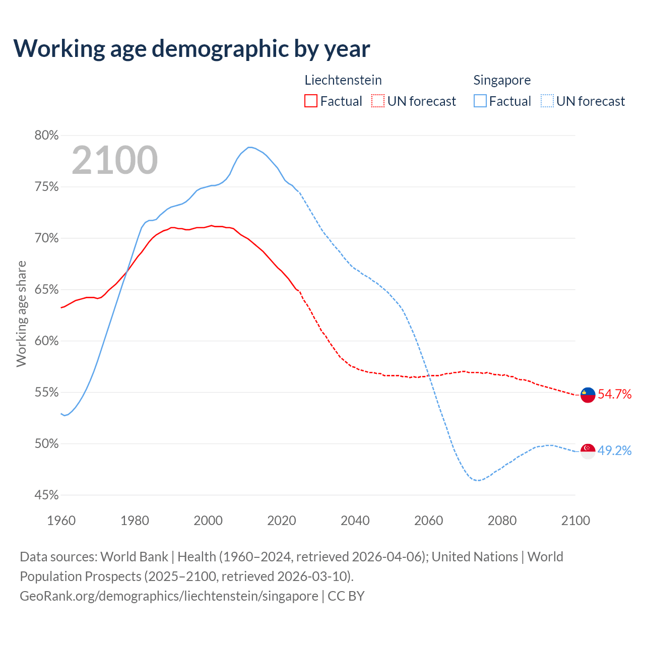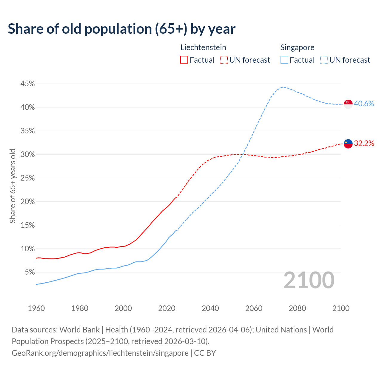 Median age Liechtenstein vs Singapore, 1960-2100