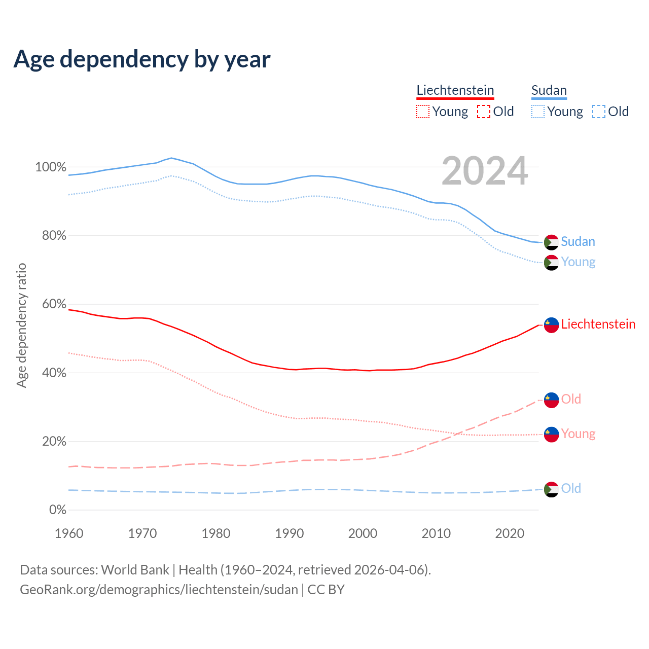 - The share of old-age demographic (65+) in Liechtenstein is 20.7% vs 3.3% in Sudan.