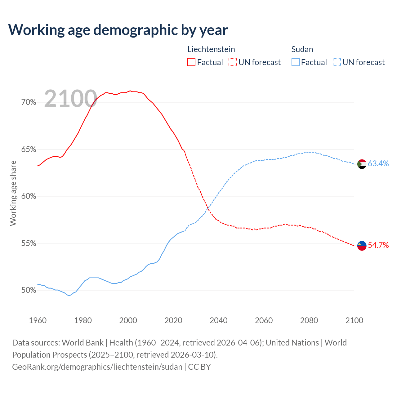 Median age Liechtenstein vs Sudan, 1960-2100