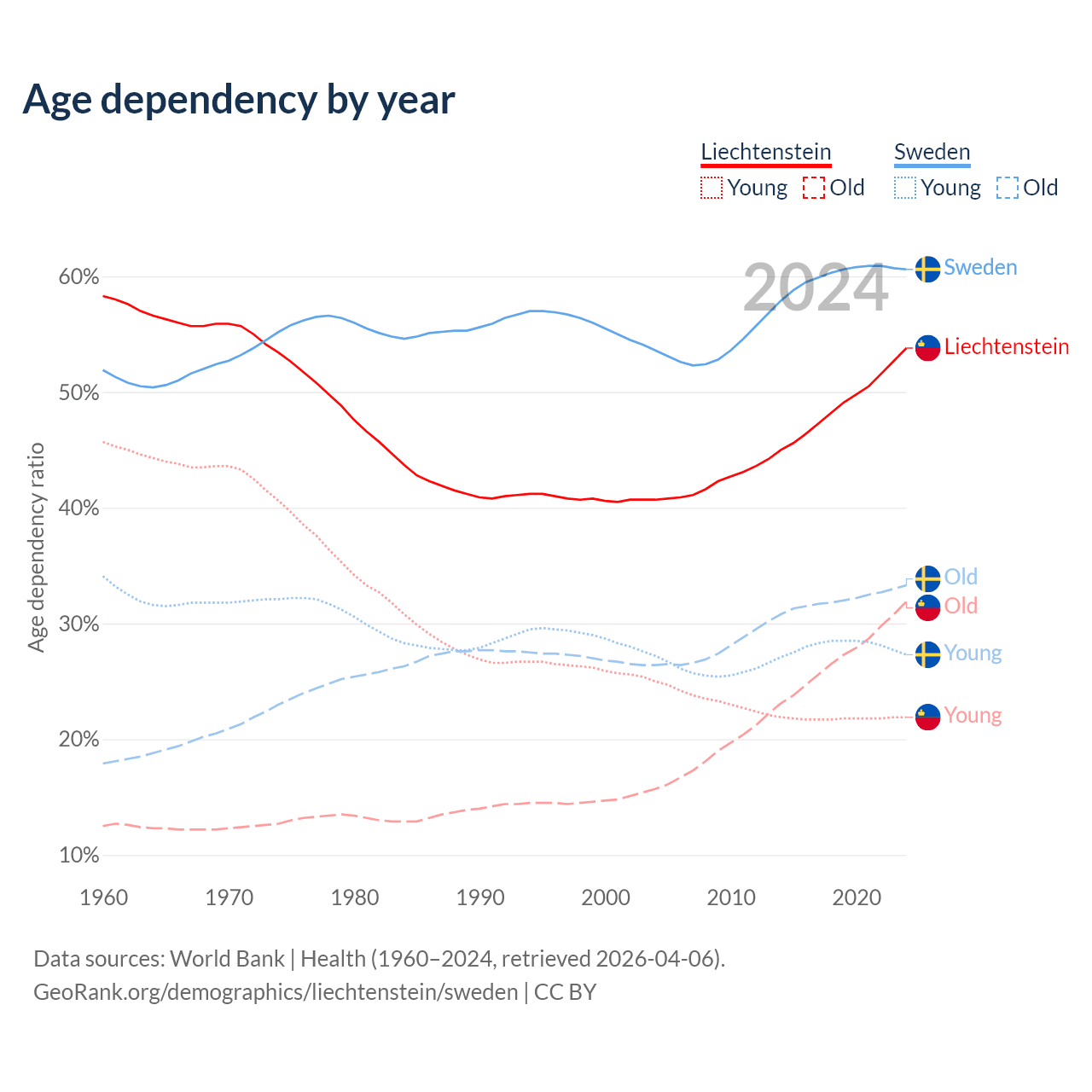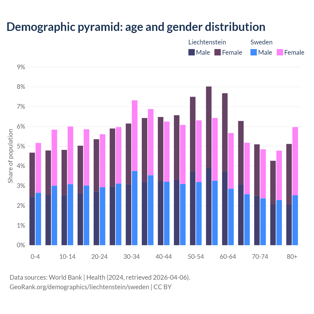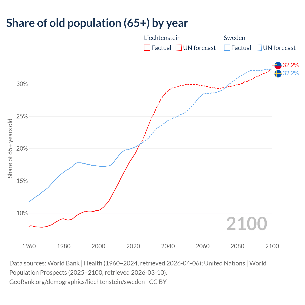 - The share of old-age demographic (65+) in Liechtenstein is 20.7% vs 20.7% in Sweden.